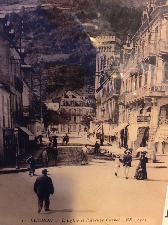 Luchon au début du siècle et la cave à vins Les Galeries Gourmandes qui a remplacé l’épicerie à l’angle droit de la photo d’époque (très belle adresse à ce propos, en bas des allées d’Etigny, pour manger des tapas et boire du bon vin).