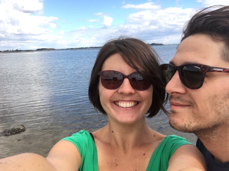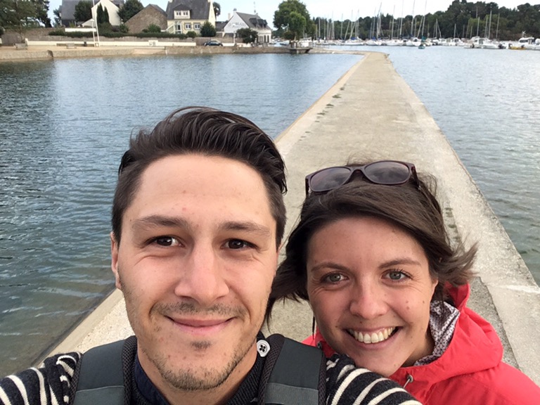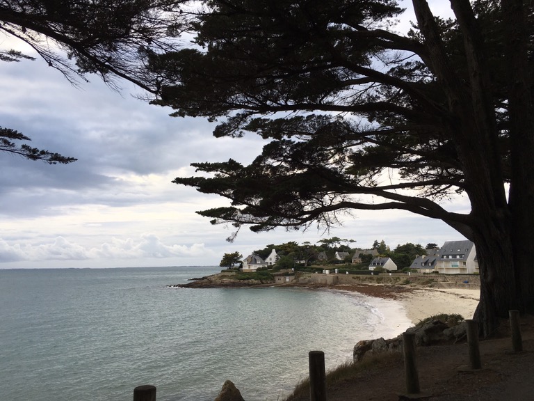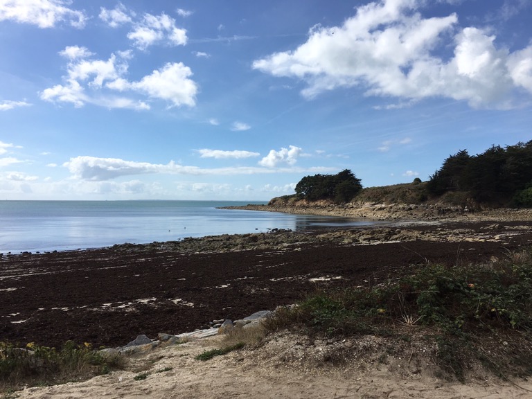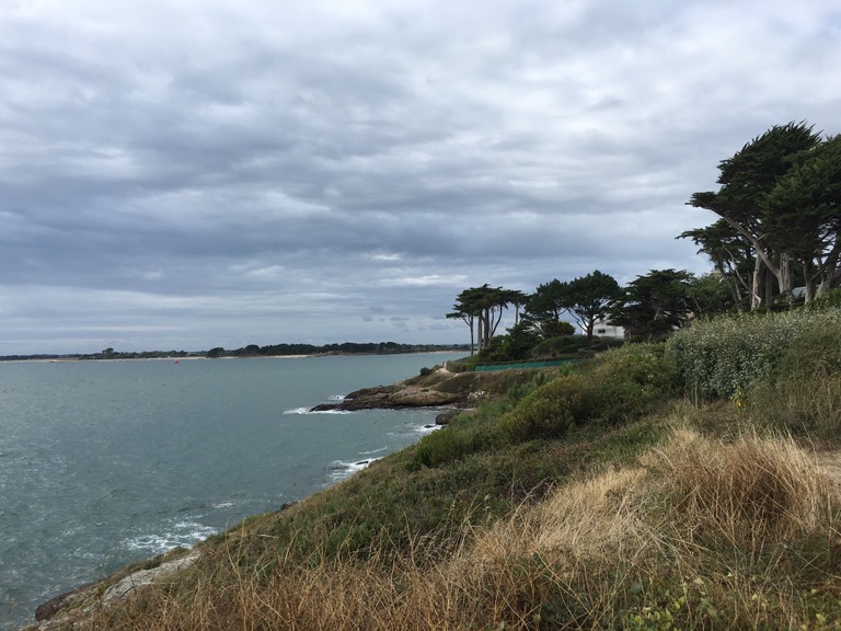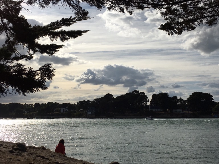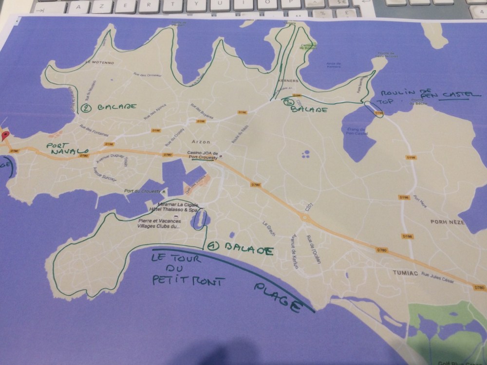 • Jour 2 : balade le long de la côte, appelé « tour du Petit Mont » depuis la thalasso jusqu’au port du Crouesty, sur les recommandations de notre ami Clément qui a pris le temps de griffonner une carte sur ses heures de dur labeur. Voici la carte en question : Puis tour en voiture le long du Motenno (voir balade 2) et stop à la pointe de Bilgroix qui offre une vue splendide sur le golfe. Pas de séjour breton sans plateau d’huitres et muscadet… pour cette dégustation, nous recommandons le NausiCaa que nous avons trouvé tout à fait par hasard suite à notre promenade. Vue imprenable sur la baie. Nous rejoignons Conleau, proche de Vannes, en fin de journée où nous séjournerons cette nuit (camping de Conleau, sans prétention, mais sympa pour sa piscine chauffée couverte et son emplacement ; 14€ la nuit pour 2 avec le combi sans électricité). Clou du spectacle : dîner en amoureux au restaurant de l’hôtel Le Roof. Sur les conseils de mon paternel, nous avons réservé une table devant la plage de Conleau. Nous avons ainsi bénéficié des lumières de fin de journée et de la vue sur les bateaux de plaisance privés des heureux Vannetais ayant élus domicile dans ce quartier au charme certain.