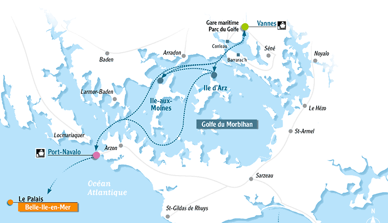 • Jour 3 : découverte du golfe en bateau grâce à la Compagnie du golfe qui propose des excursions à la journée avec escale ou non sur une ou deux îles de l’archipel. Nous avons opté pour un tour avec escale sur l’île aux Moines soit un départ vers 10h de Vannes, 2h de bateau, puis 5h30 d’escale sur l’île (le temps d’une jolie randonnée, d’un casse-croûte et même d’une sieste sur la plage !) et retour en 1h à la gare maritime, un peu avant 19h. La météo fut clémente et rendit la balade aussi esthétique qu’intéressante. Voici la carte maritime de la balade en question :