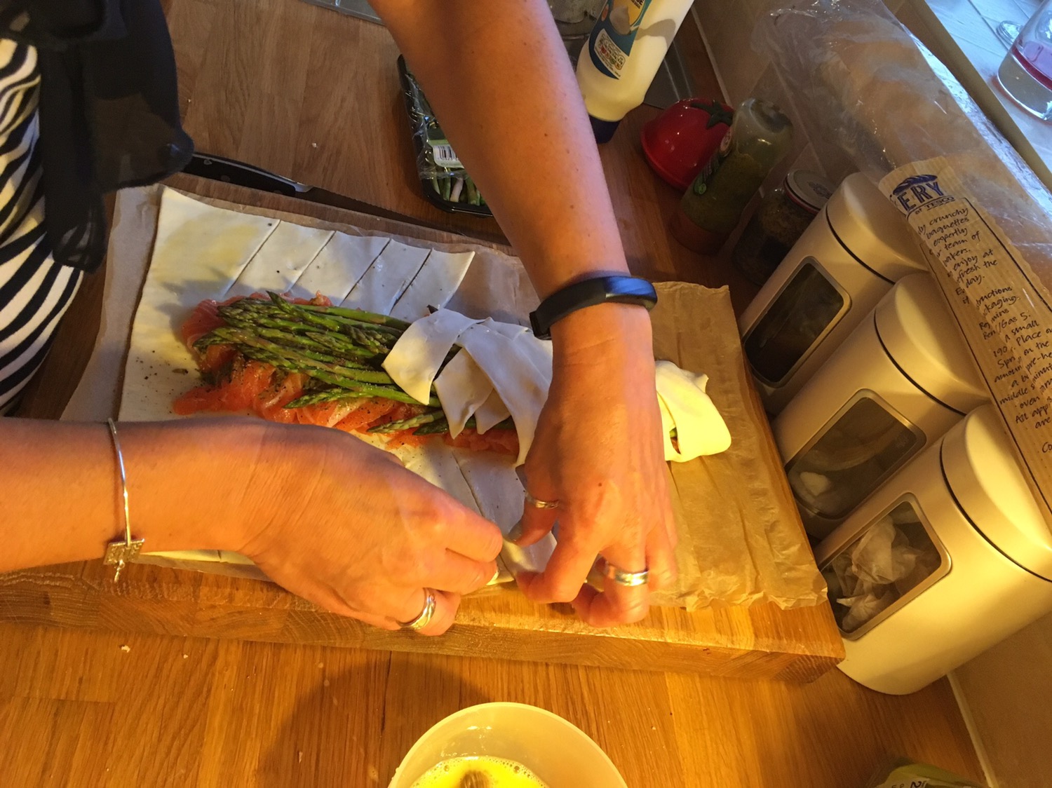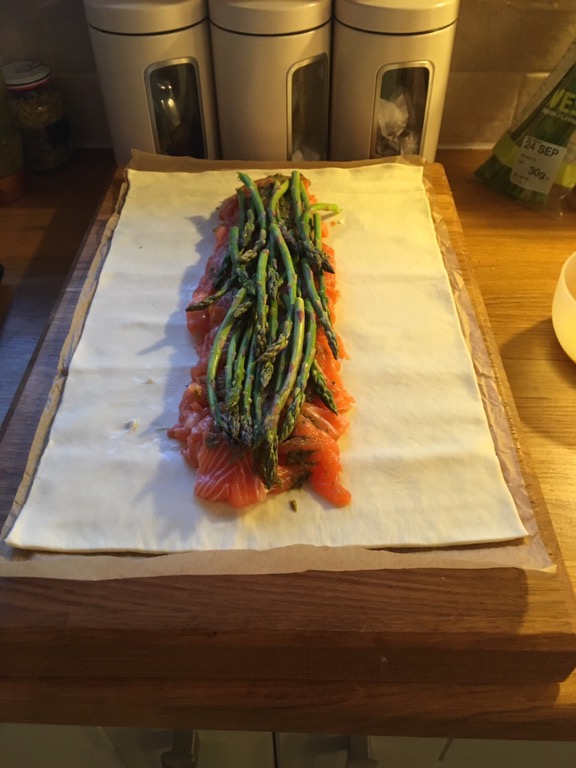 Je n’ai pas pu m’empêcher de traduire littéralement le titre de cette recette ! Voici donc comment cuisiner a salmon and asparagus plait, tresse de saumon et d’asperges. On the first evening at Tasha’s house, she made this dish for us!