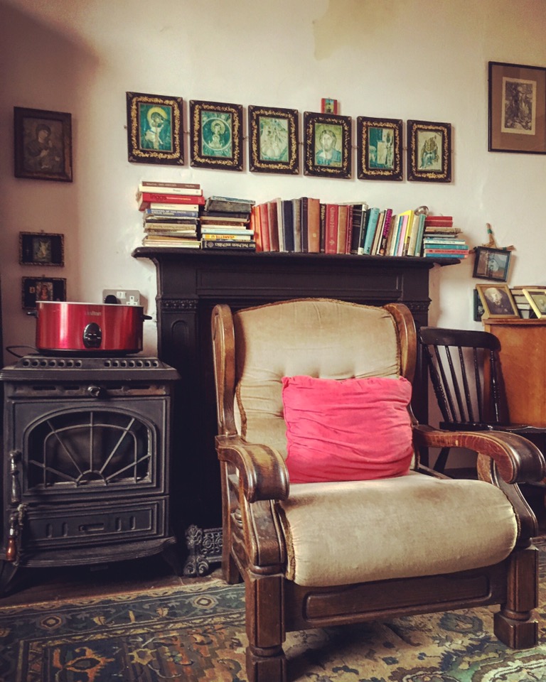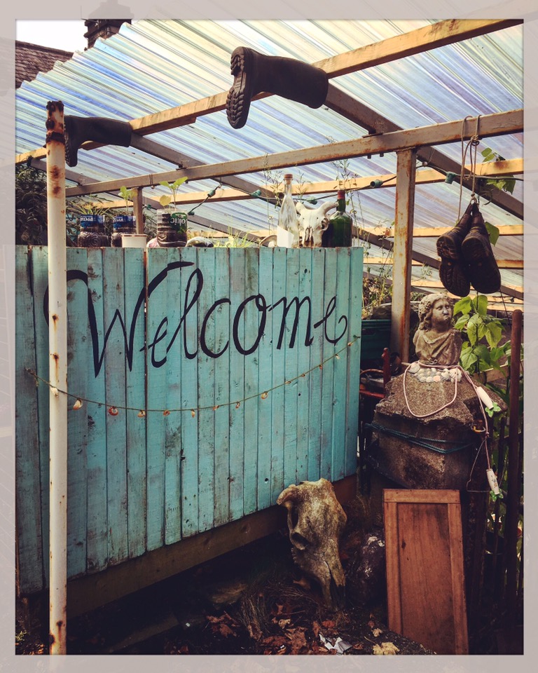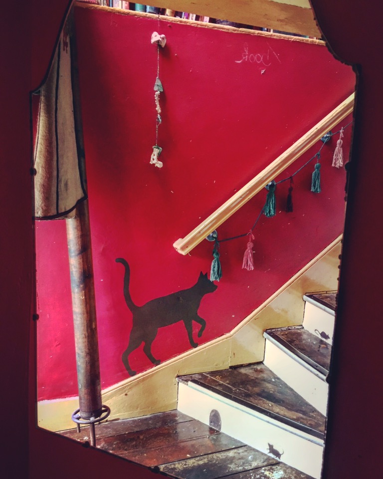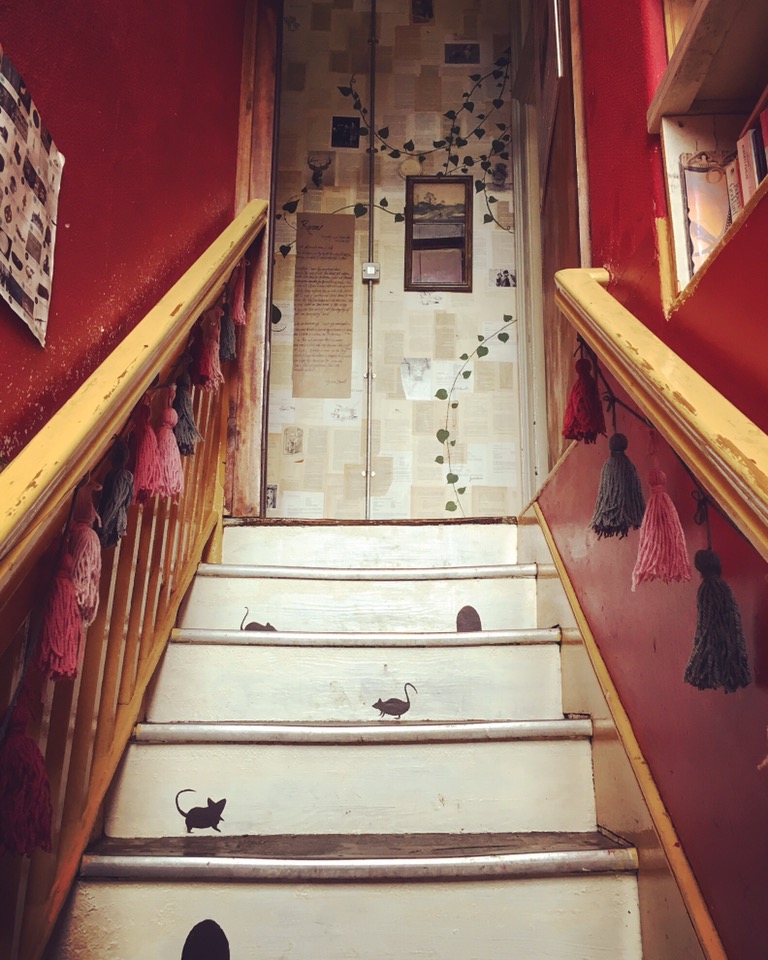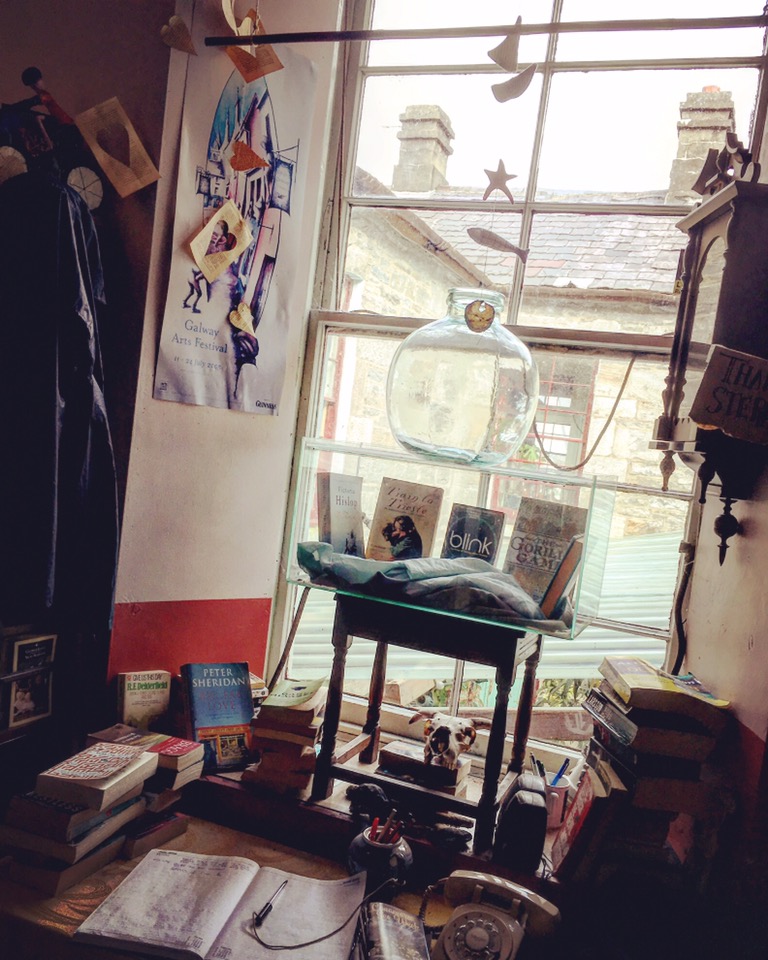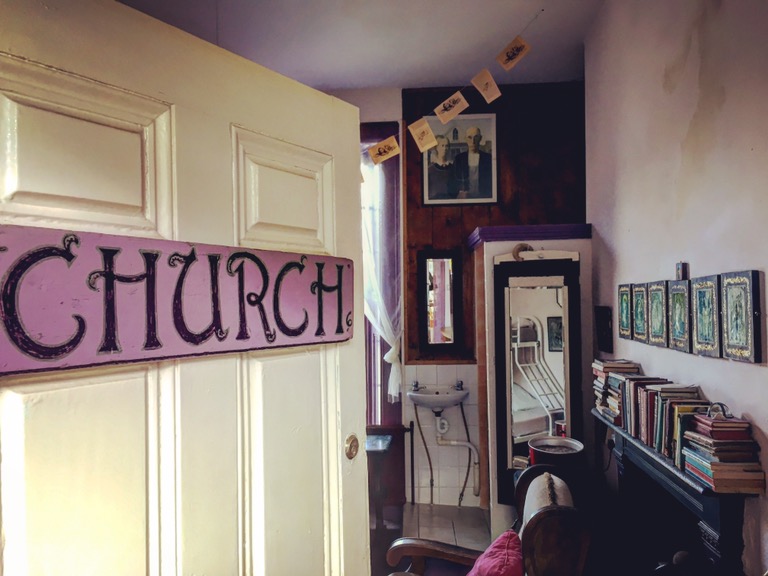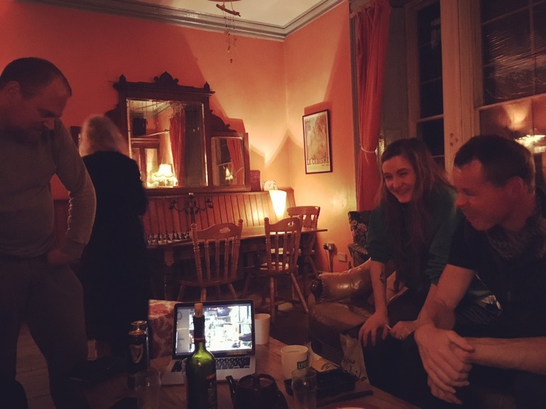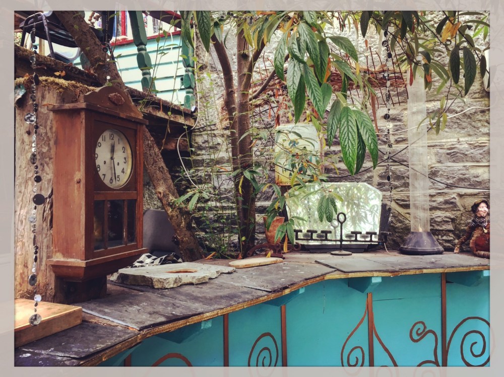 Une voix française. Allez savoir pourquoi cela est si rassurant. Deux jeunes femmes volontaires elles aussi viennent à notre rencontre. Lynn et Marion. Elles deviendront notre phare pour les deux jours à venir, date de leur départ pour le Nord de l’Irlande. Stephen, le boss, n’est pas bien loin, on le verra tout à l’heure. En attendant, elles nous font visiter les lieux. Notre déambulation éveille deux mots dans mon esprit : magique et chaotique. Une sensation de douce étrangeté nous enveloppe, tout est si cosy. Des coins et des recoins partout, impossible d’embrasser l’espace d’un coup d’œil. Je découvre encore des meubles et des objets à l’heure où je vous écris. Une sorte de brocante géante où rien ne serait à vendre. Disons plutôt que les milliers de visiteurs ayant un jour mis les pieds ici semblent avoir chacun oublié une partie de leurs effets. Un monde à part, entre le pays des merveilles d’Alice et les aventures des chevaliers de la table ronde. Nous sommes en terre celtique, ne l’oublions pas. Un air de chant gaélique flotte continuellement dans cette vaste maison (hantée, qui sait ?).