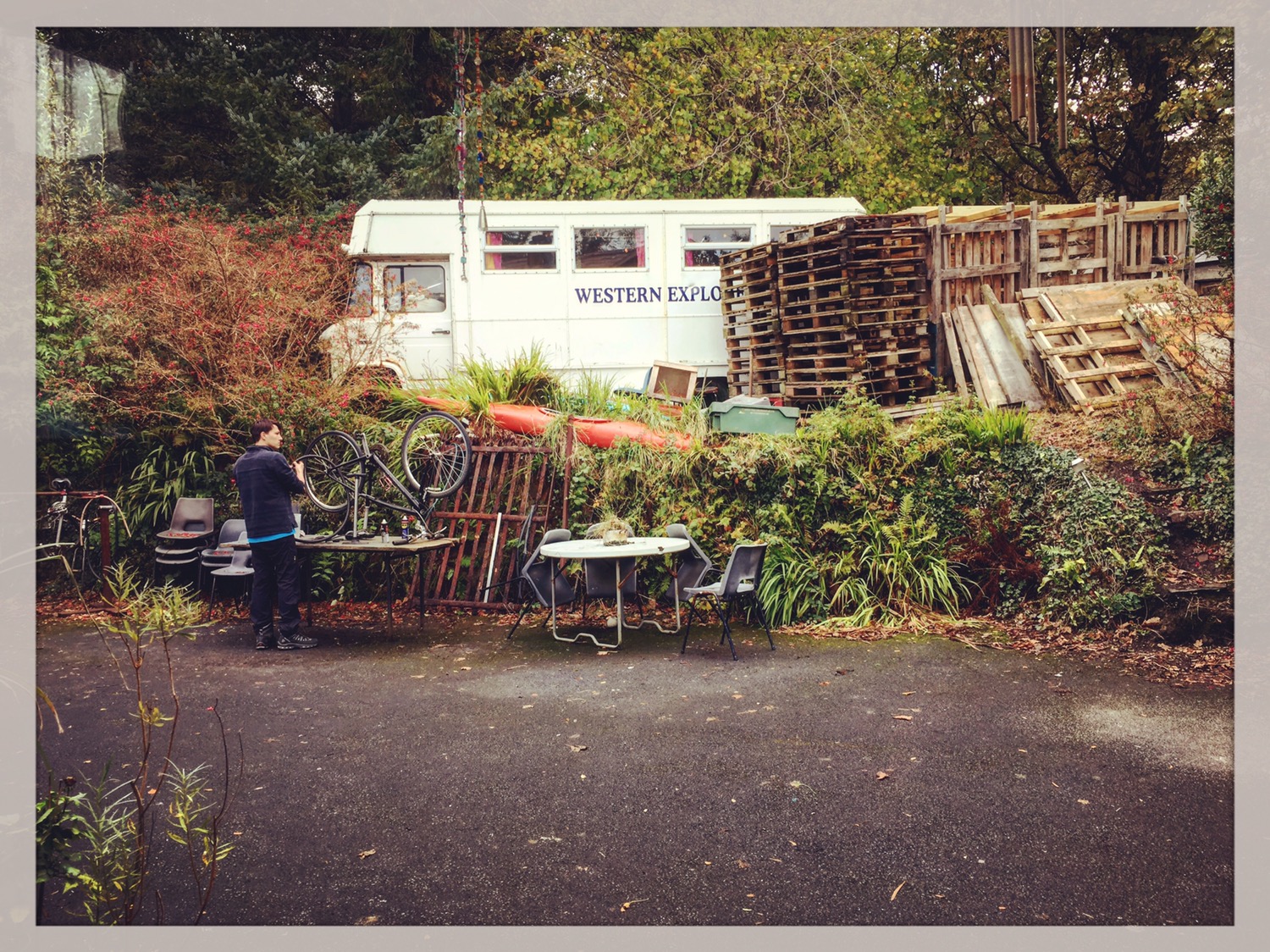On s’approprie les lieux… Simon donne un coup de main pour réparer les vélos de location.