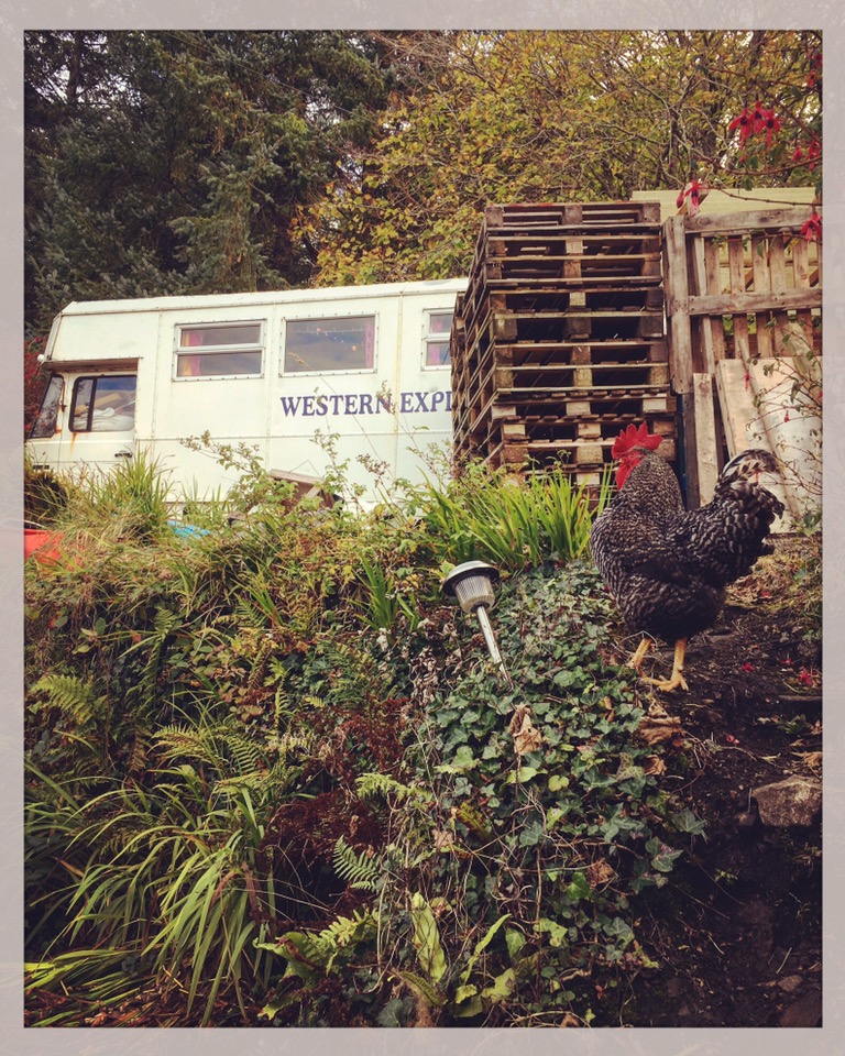 L’extérieur de l’auberge et l’une des 25 poules qui la gardent.