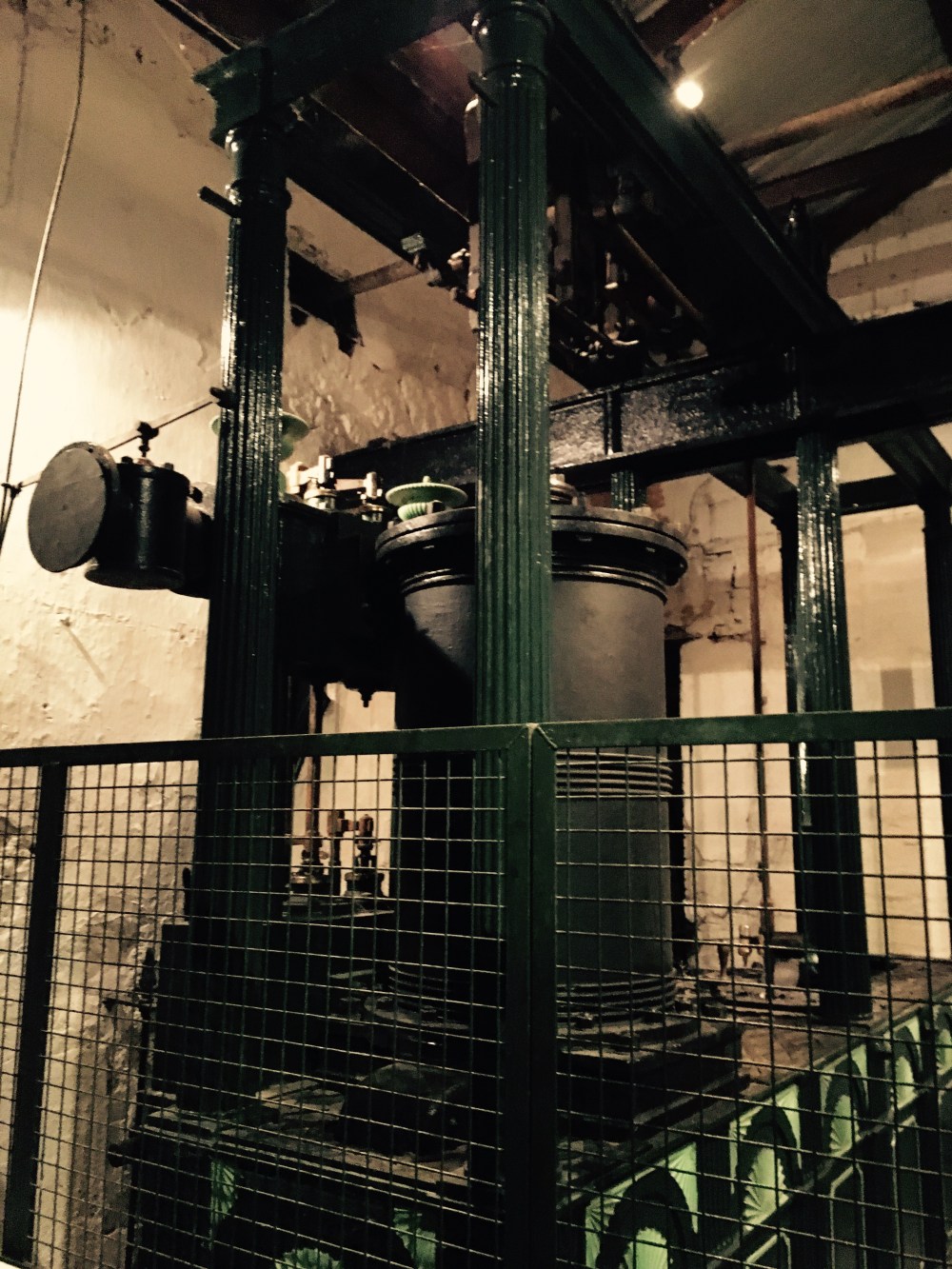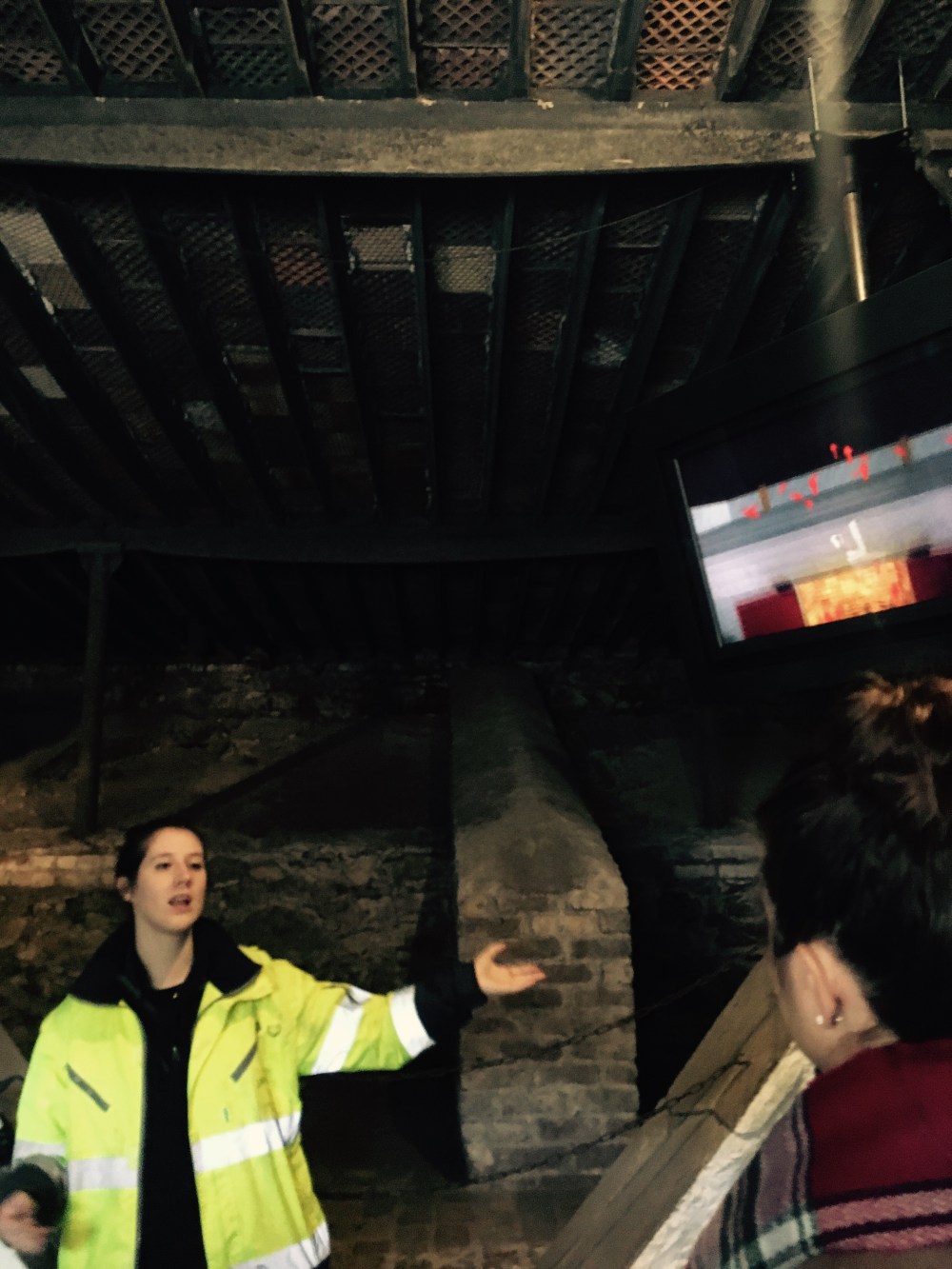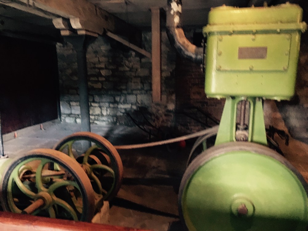 Les disques noirs sur les murs du magazin à grain (ci-dessous) sont des barres de fer qui renforcent les parois lors du remplissage. Le magasin comporte 5 étages qui stockaient 250 tonnes d’orge chacun à l’époque !
