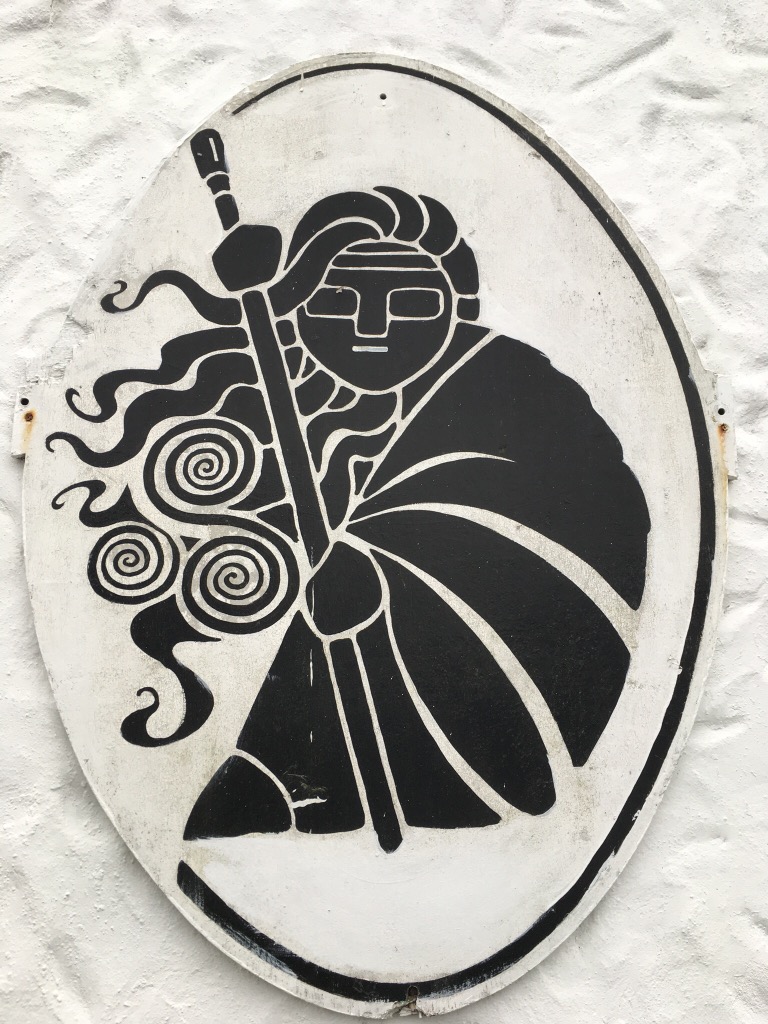 Chaque symbole a ainsi une signification propre. Les petits losanges sur mon pull, par exemple, représentent les champs des différentes tribus et familles de l’île, délimités par les petits murs de pierre que vous avez pu découvrir plus haut en photo.