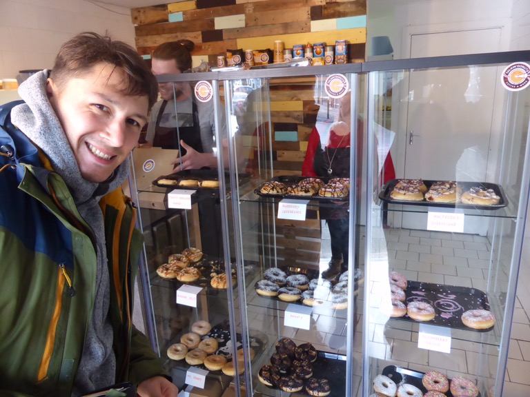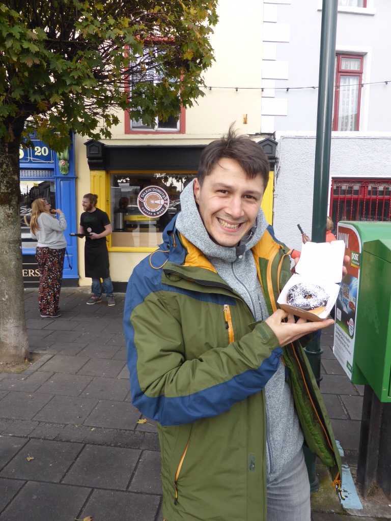 Nous dormons près de Cork ce soir donc nous ferons plusieurs étapes pour égayer la route, à commencer par un casse-croûte et un amaziiiiing donuts à Ennis. Simon très très content !