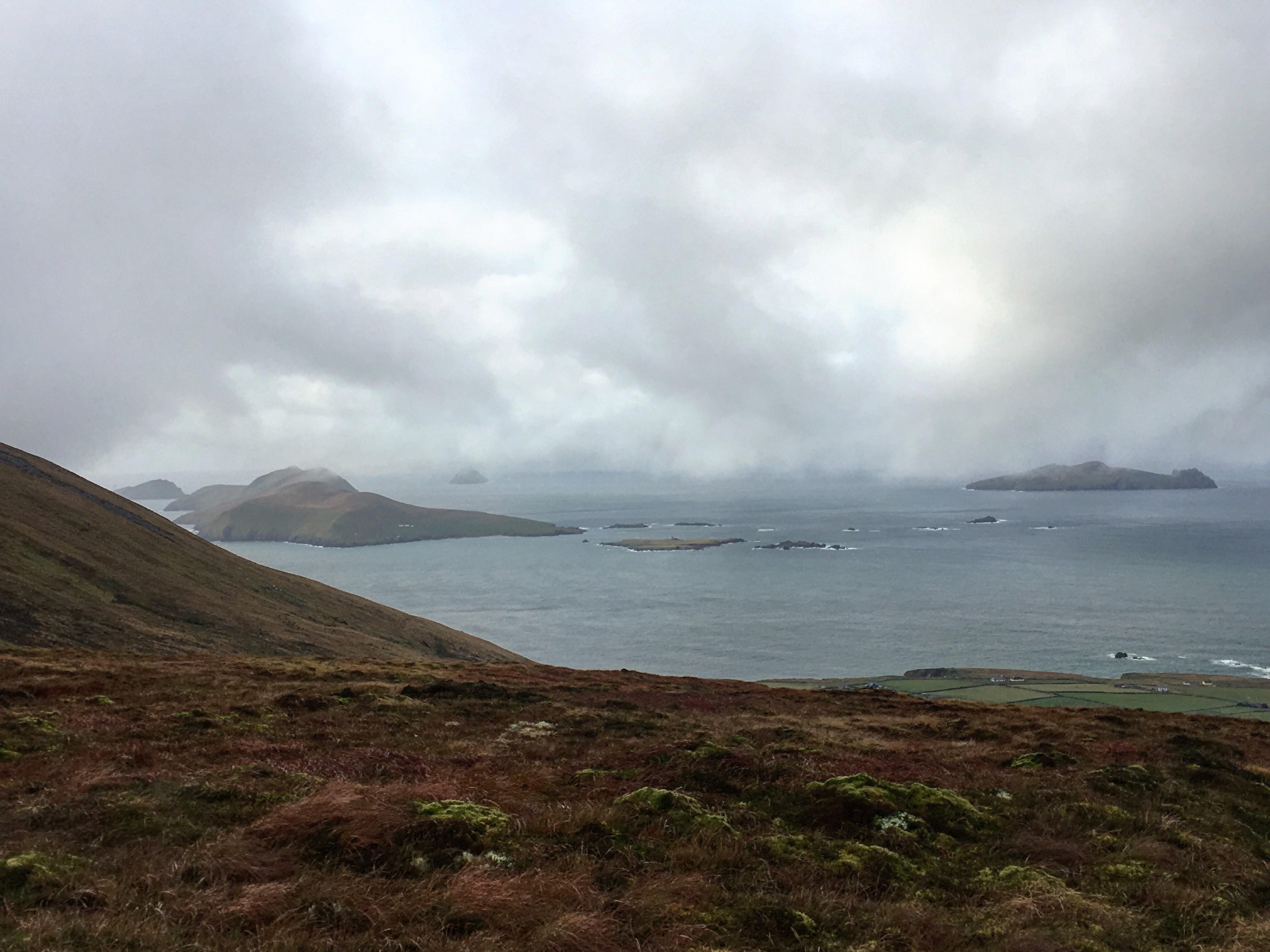 Nous nous régalons tout de même des couleurs et de la vue sur les îles Blaskets qui tentent de se cacher entre les nuages bas de ce mois de décembre.
