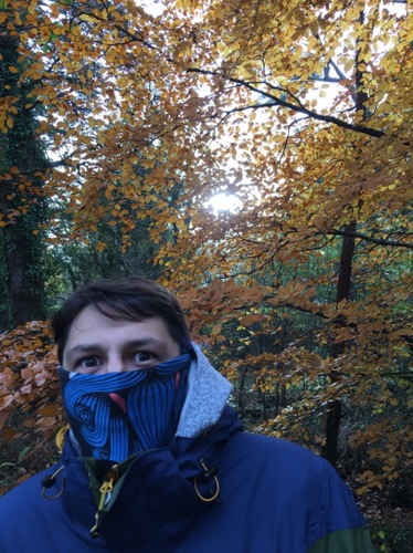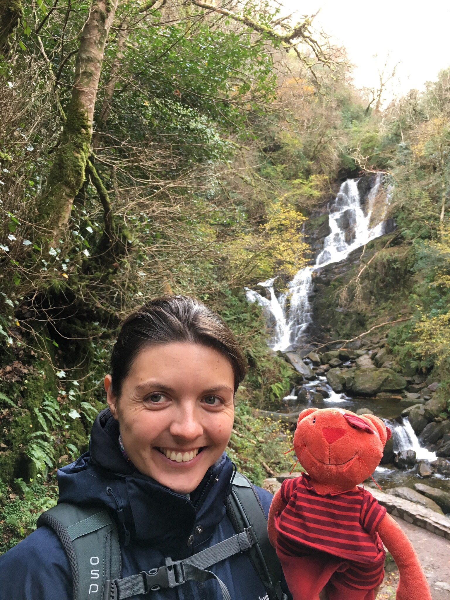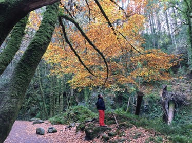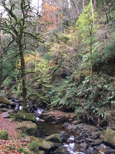 Torc Waterfall. Une belle cascade de 18m dans les bois parés de couleurs d’automne. Bernard est ravi ! Simon fait peur en revanche…