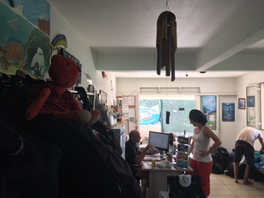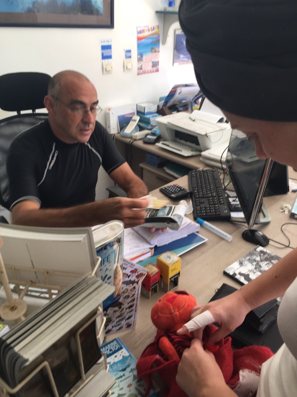 Manue règle la note, bah oui, rien n’est gratuit, pas même un baptême pour le plus cool des chats pirate !