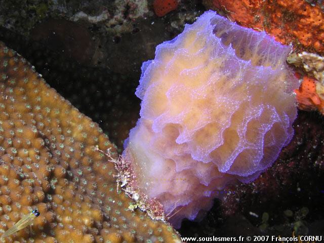 L’éponge vase fluorescente (pour de vrai, elle brille !). Saviez-vous que les éponges, tout comme les coraux et les anémones, sont des animaux ? En vérité, seules les algues sont des végétaux sous l’eau ! Scientifiquement, les éponges comme celles-ci sont donc des zoophytes c’est-à-dire des animaux-plantes. Incroyable non ?