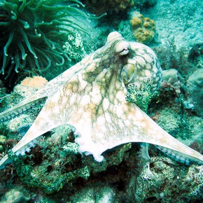Le chatrou, poulpe commun, il est aussi beau à regarder sous l’eau qu’à déguster en fricassée. Miam !