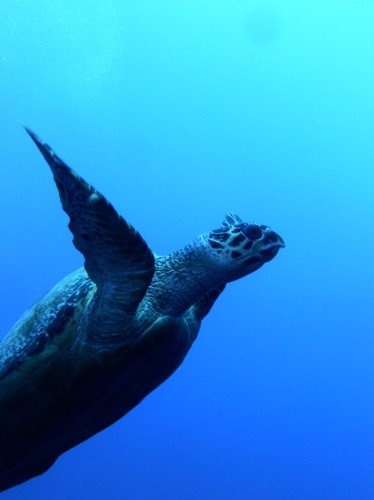 Tortue imbriquée volant vers la surface pour respirer (une inspiration lui permettant de rester env. 45mn sous l’eau…!)