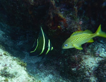 Poisson ange français à gauche et gorette jaune à droite