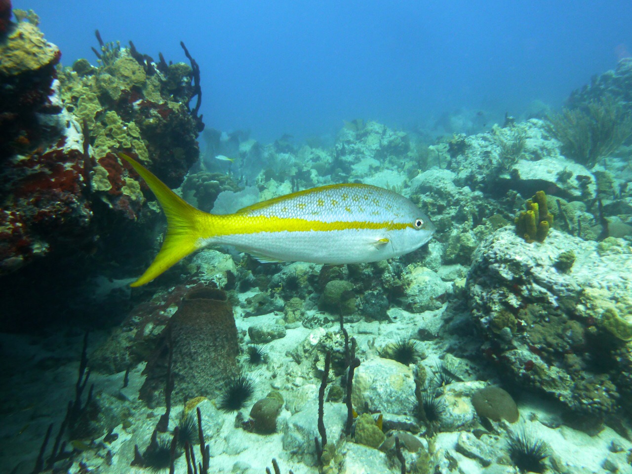 Une sarde à queue jaune… qui devient rouge la nuit pour se cacher des prédateurs pendant qu’elle dort (le rouge étant la première couleur à disparaître sous l’eau)