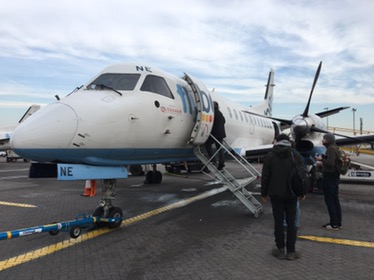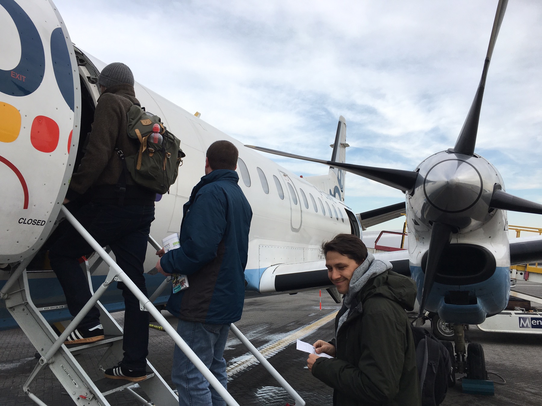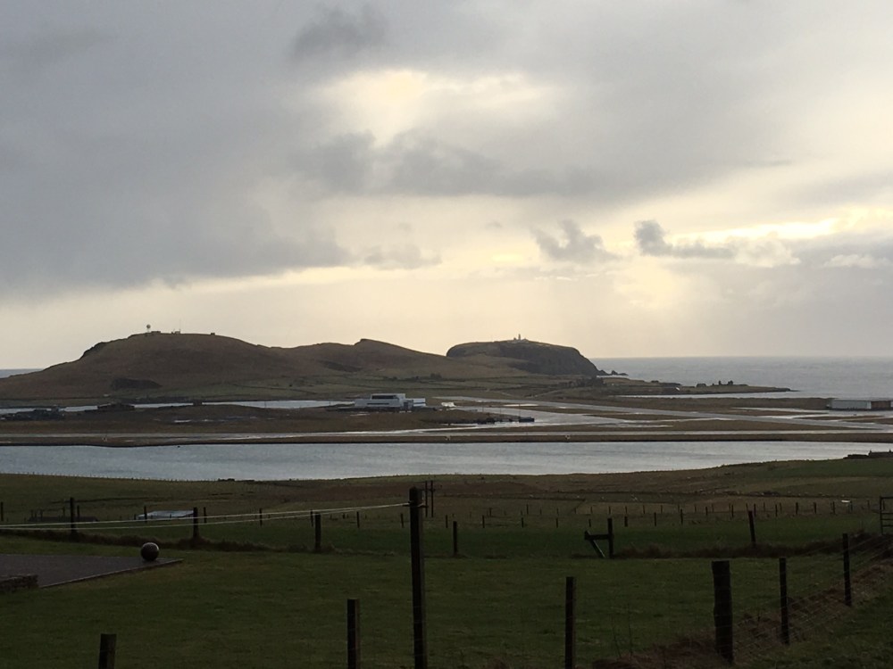 Nous avons voyagé jusqu’ici avec un tout petit avion de 36 places depuis Glasgow… En arrivant, nous avons l’impression de pouvoir toucher le ciel tant il est bas ! Les collines hautes de 200m bloquent même les nuages…