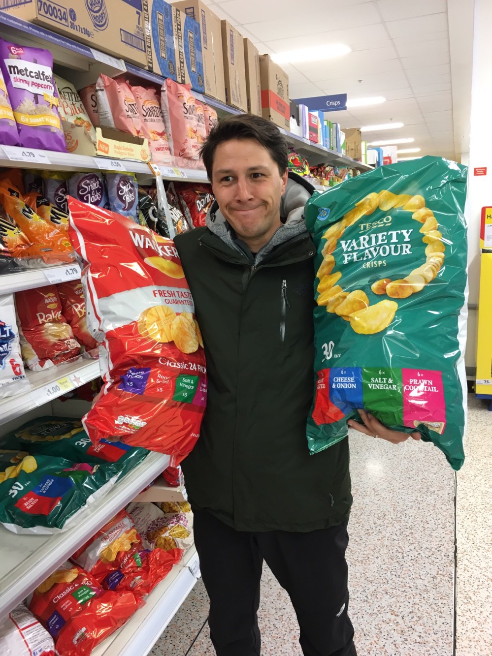 Quand nous sommes arrivés vendredi il faisait nuit et nous avions besoin de quelques vivres pour les jours à venir. Simon, dans le Tesco local (l’unique supermarché des Shetland en fait !) se demande en combien de temps il pourrait avaler autant de chips 😮 Sont pas faits comme nous par ici hein !