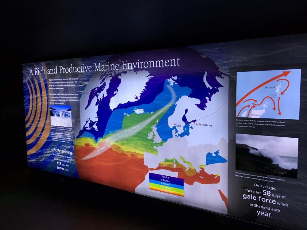 Musée du phare très intéressant qui nous en apprend plus sur les courants marins, la météo et les espèces locales (oiseaux et mammifères) pouvant être observées aux alentours. Vous remarquerez sur la carte ci-dessus que les Shetland bénéficient des courants chauds dans le prolongement du golf stream. Rare est la neige ici donc. Ca caille quand même hein !