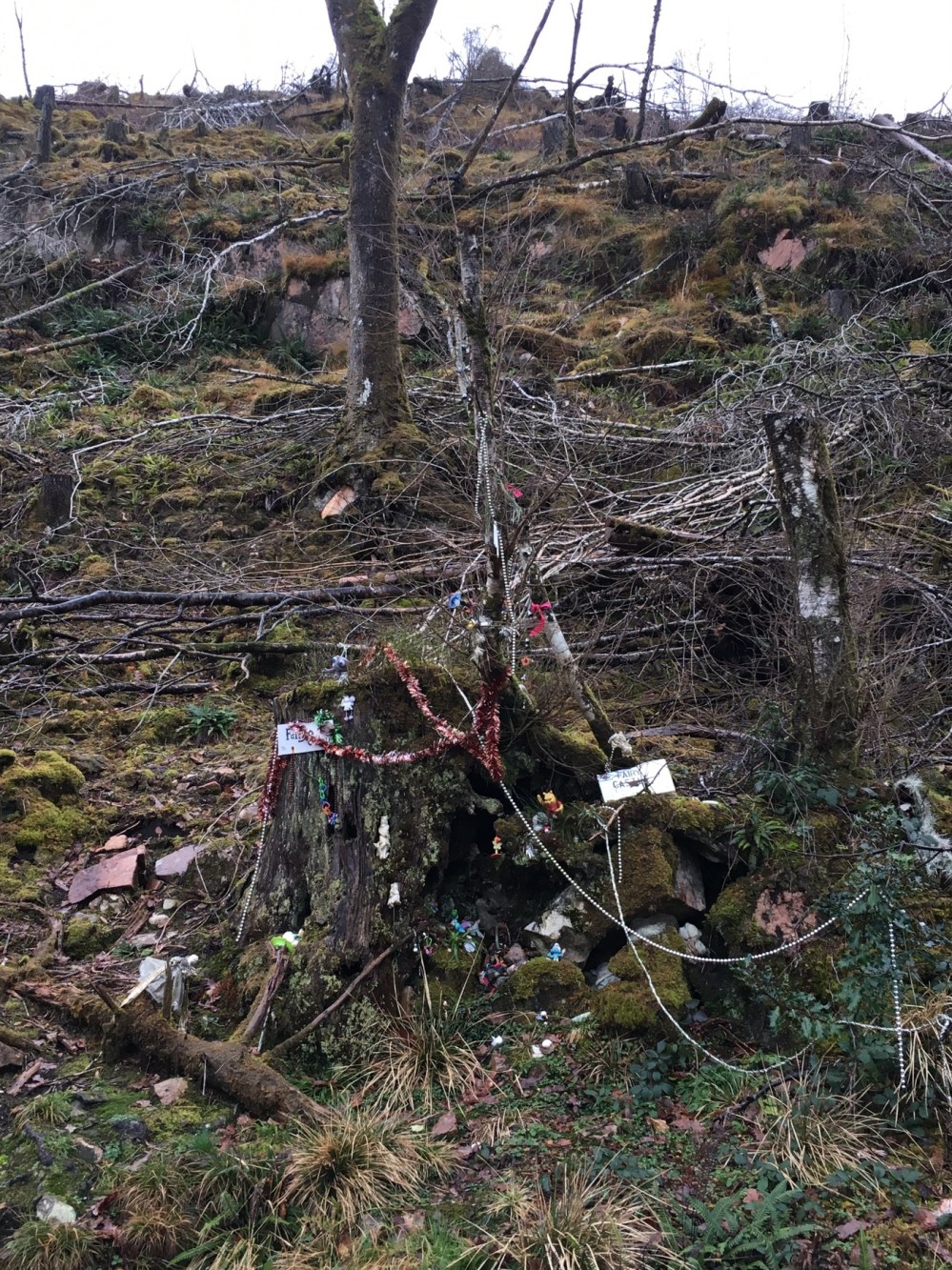 Hier, nous sommes allés marcher à Inveraray, village situé à 7 miles d’ici. Regardez ce pin, son tronc est tout mou ! Il a entre 400 et 500 ans !