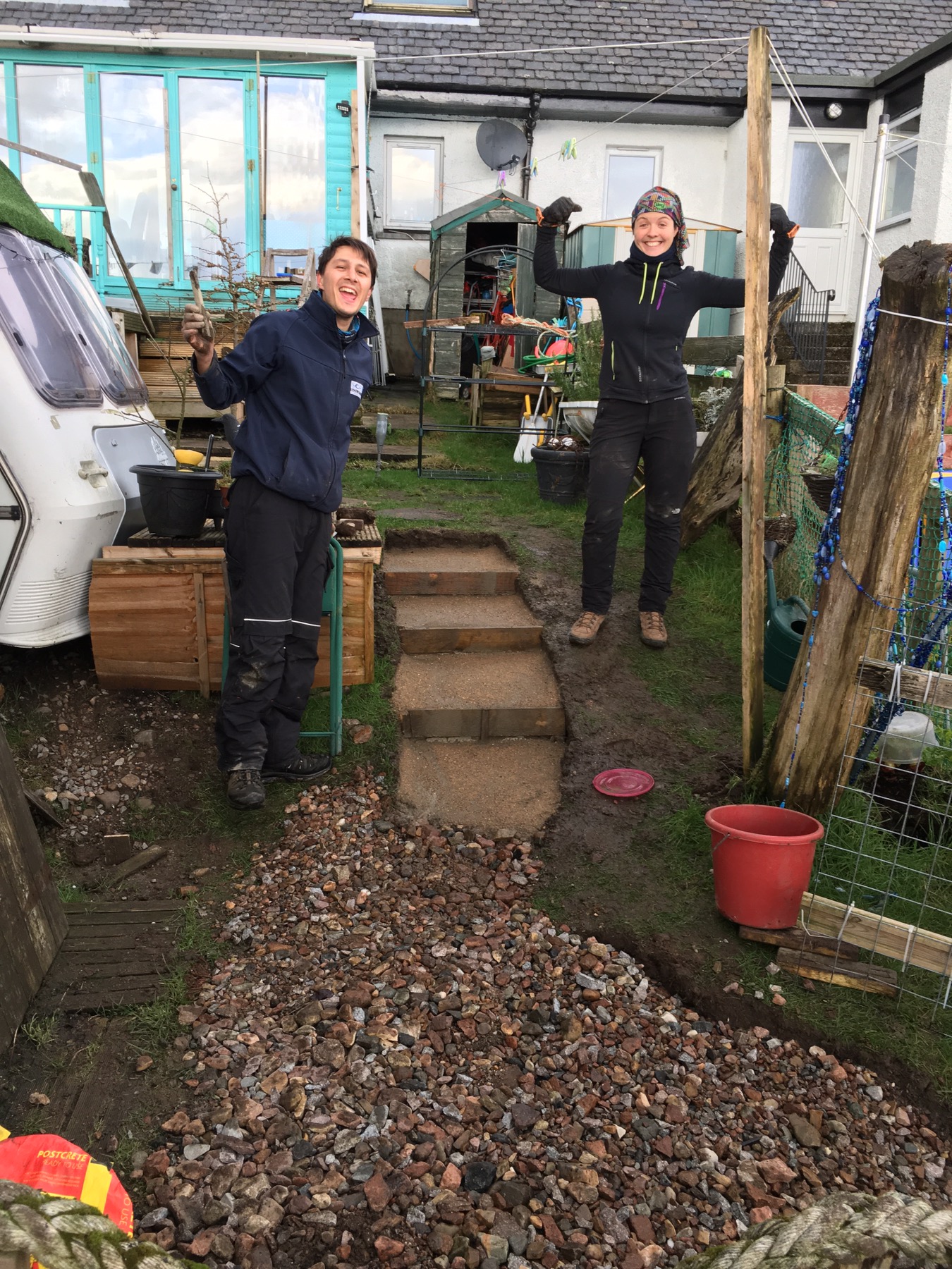 L’une de nos premières missions, mercredi, a été de construire un escalier extérieur pour faciliter l’accès à la maison. Quelques coups de pelle, du ciment et des pierres ramenées de la plage plus tard, voici le résultat ! Good job (surtout pour Symon qui a fait le gros du boulot soyons clairs !)