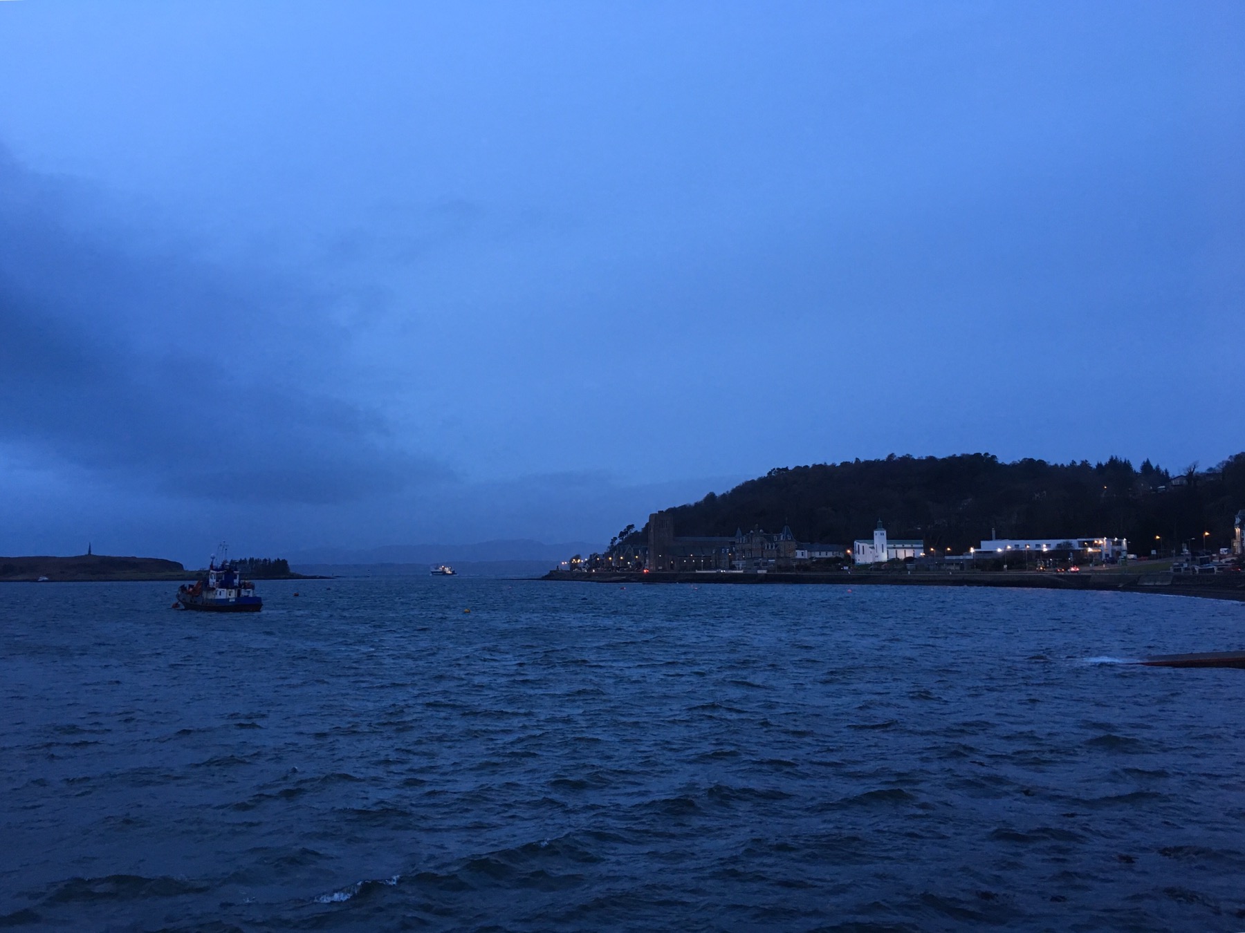 Dernières lueurs du jour et tombée de la nuit sur Oban. Diner au restaurant Eeusk, festival de saveurs et de poissons ! On recommande vivement 😋