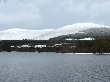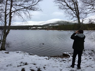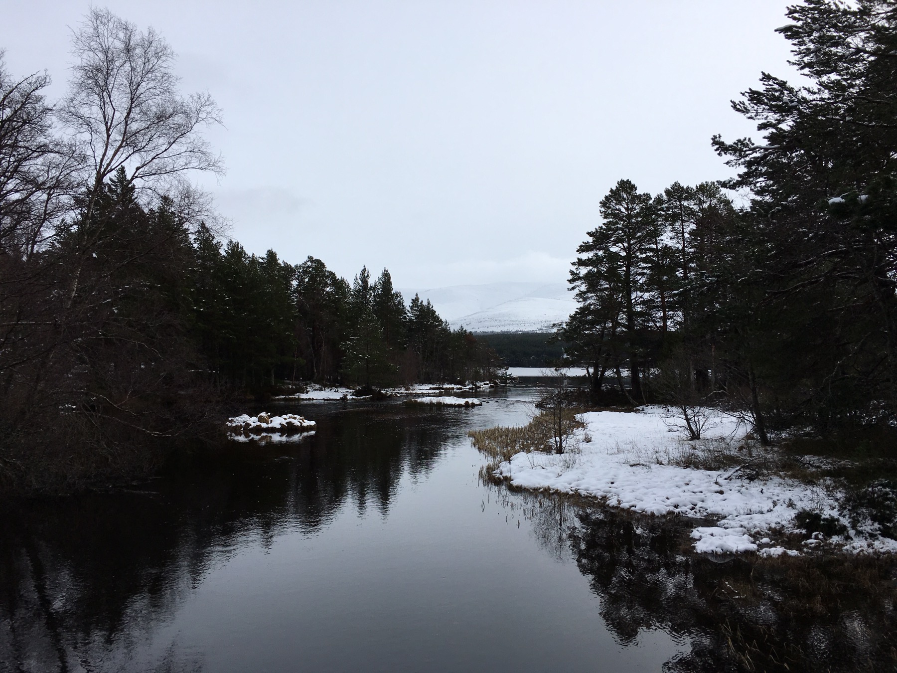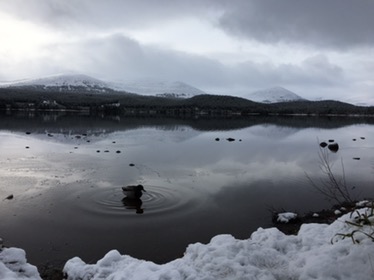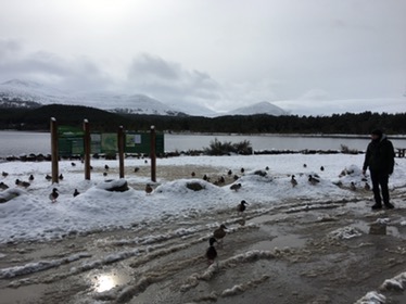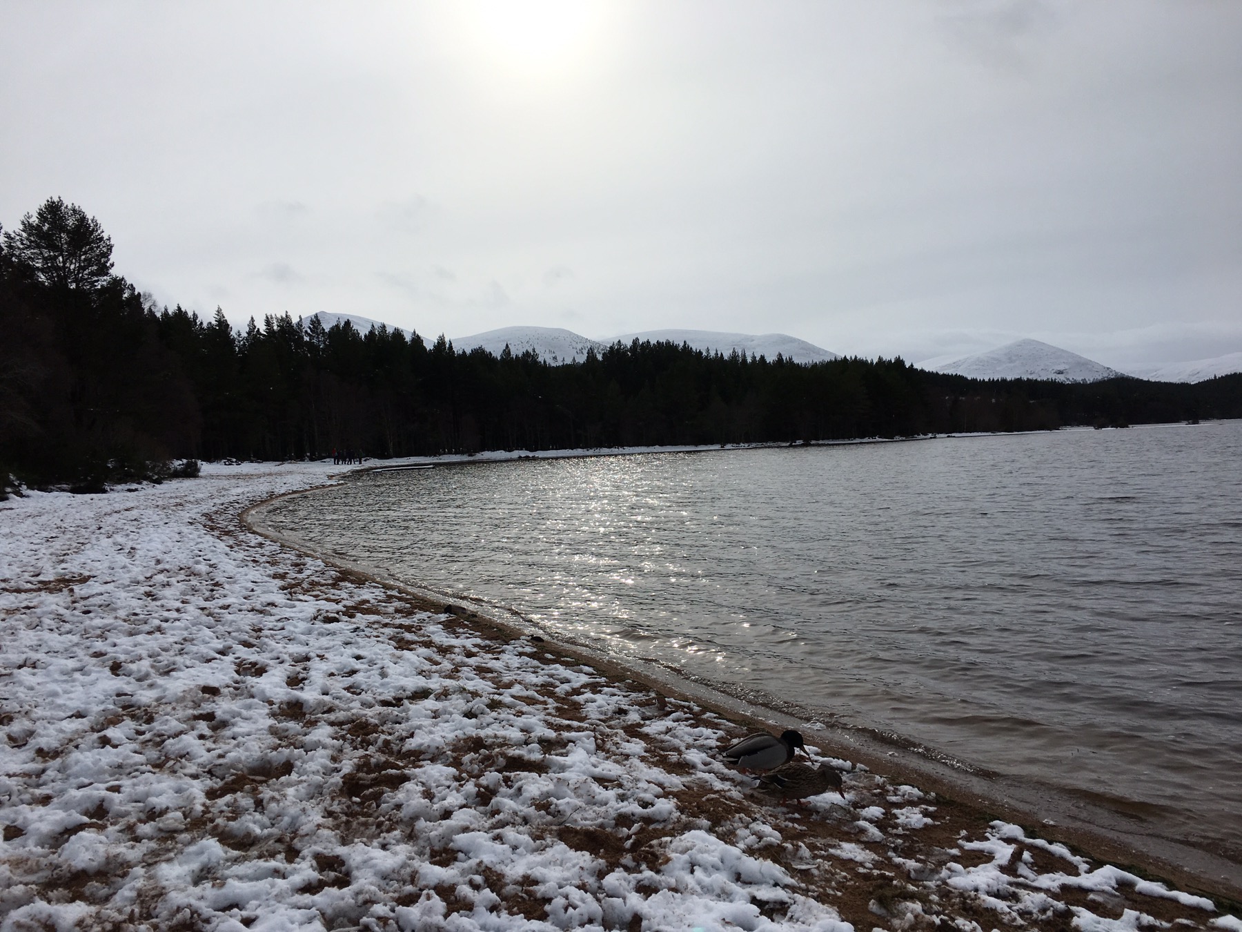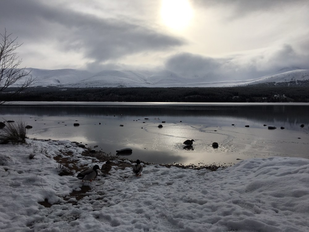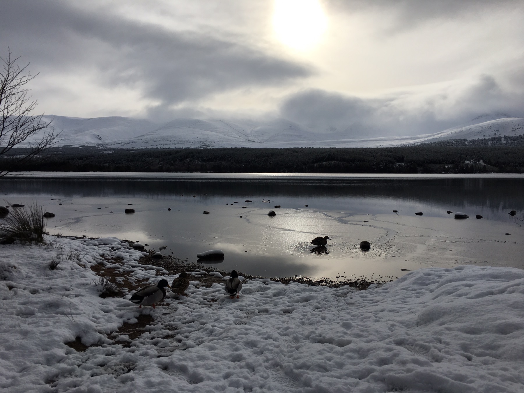 Juste après avoir déposé Yves et Cricri à la station de bus de Inverness, Simon et moi avons pris la route pour découvrir les entrailles du Parc National des Cairngorms. Sous la neige ! Véritable spectacle glacé, nous avons fait un premier arrêt sur les bords du loch Morlich. Nous avons donné un peu de pain de mie à trois canards avant d’en voir débarquer des dizaines d’autres quelques minutes plus tard. Malins les gars !