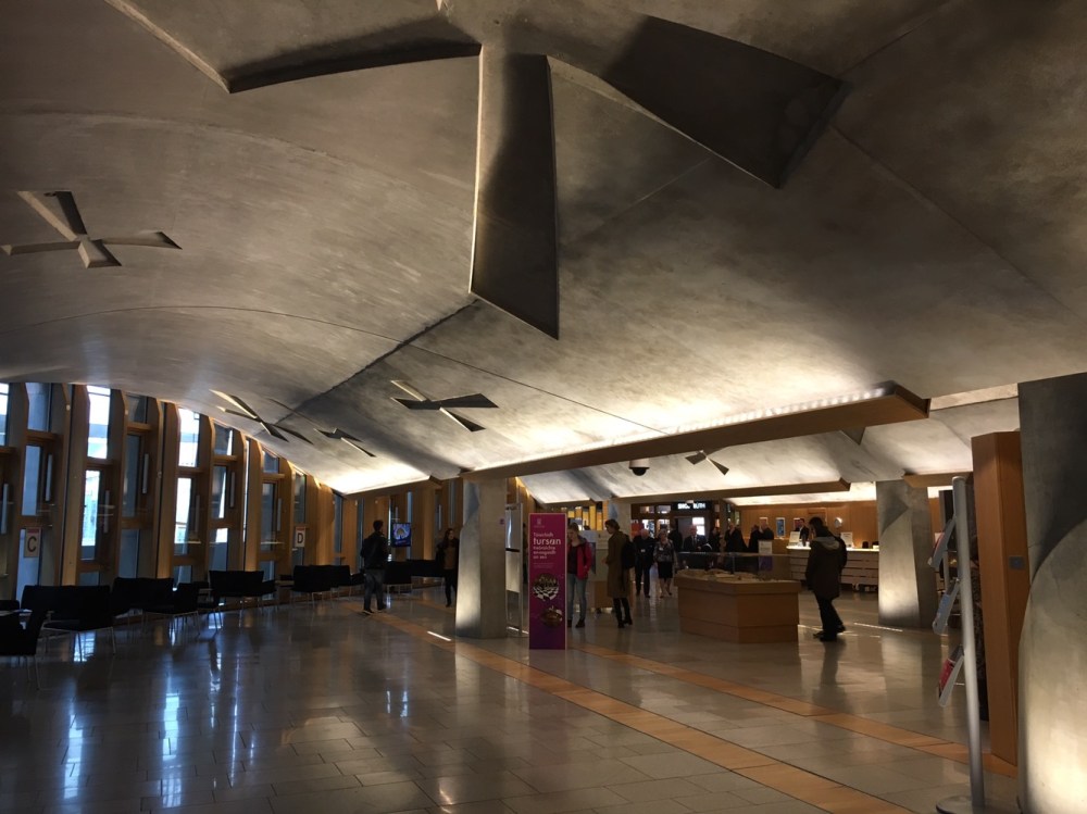 Le hall d’accueil avec ses formes de drapeau écossais au plafond. Et un accueil vraiment pro, des mini visite guidées pour comprendre le rôle du Parlement et un accès à la salle des débats. Une bien belle surprise politique… Ca change ! Bon, il semblerait juste que le projet ait coûté 414 millions de livres au lieu d’une vingtaine prévue au départ…