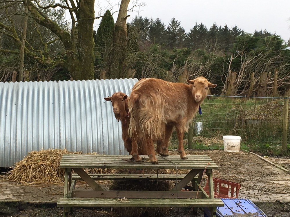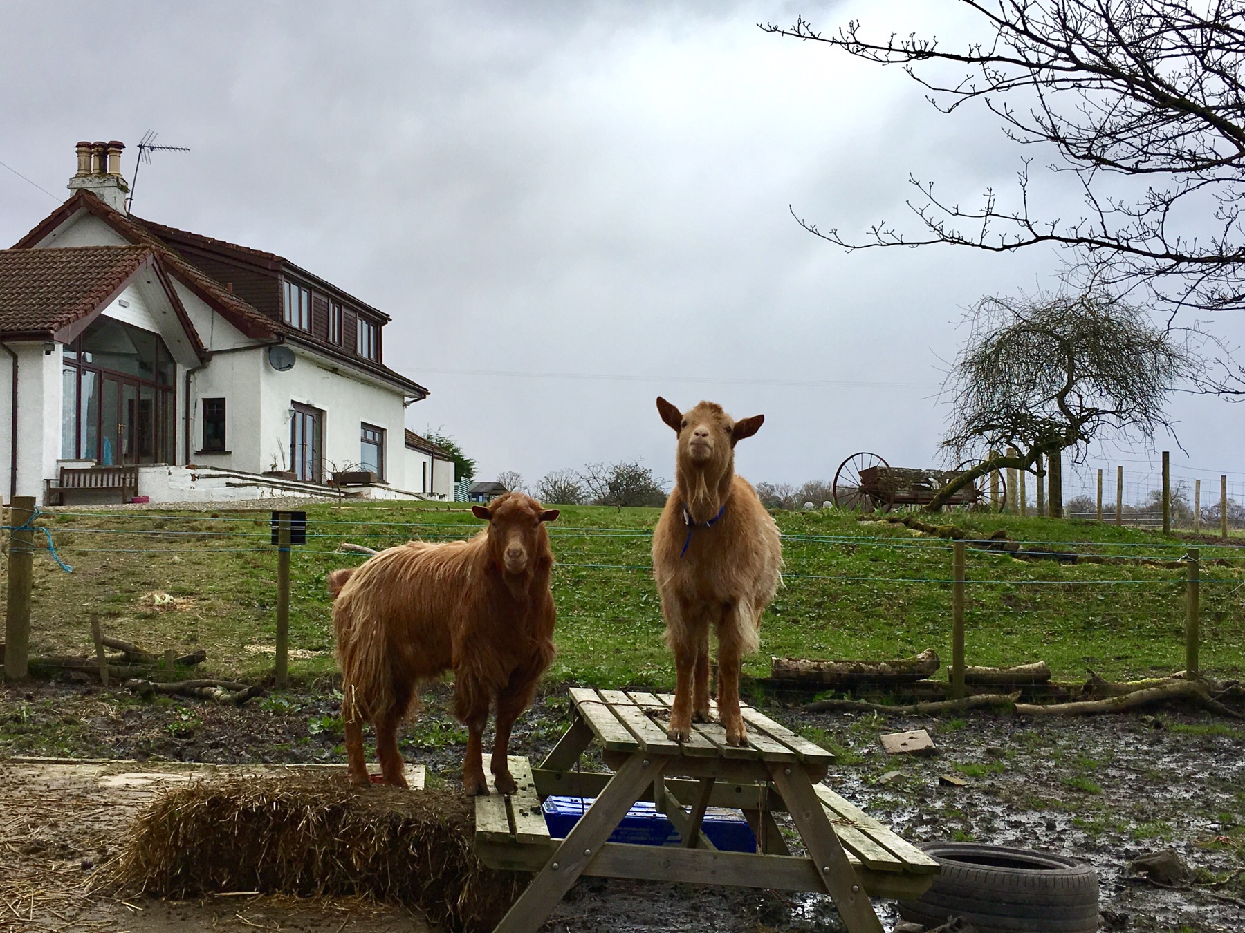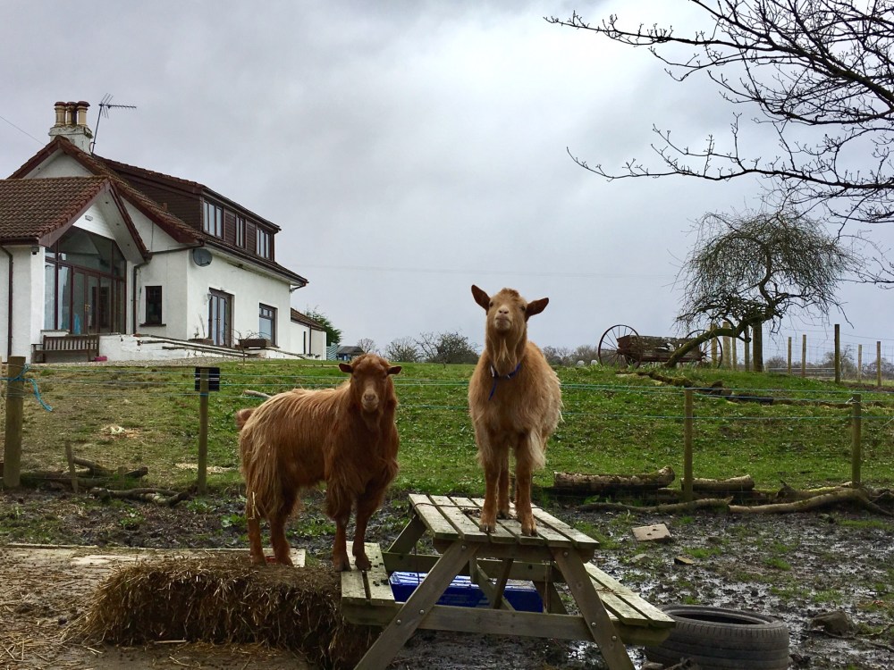 Et voici les biquettes de la maison, perchées sur leur table de pique nique. Il nous manque à rencontrer et vous présenter le chien, les chats, les faisans et les dindons. Pour un prochain article !