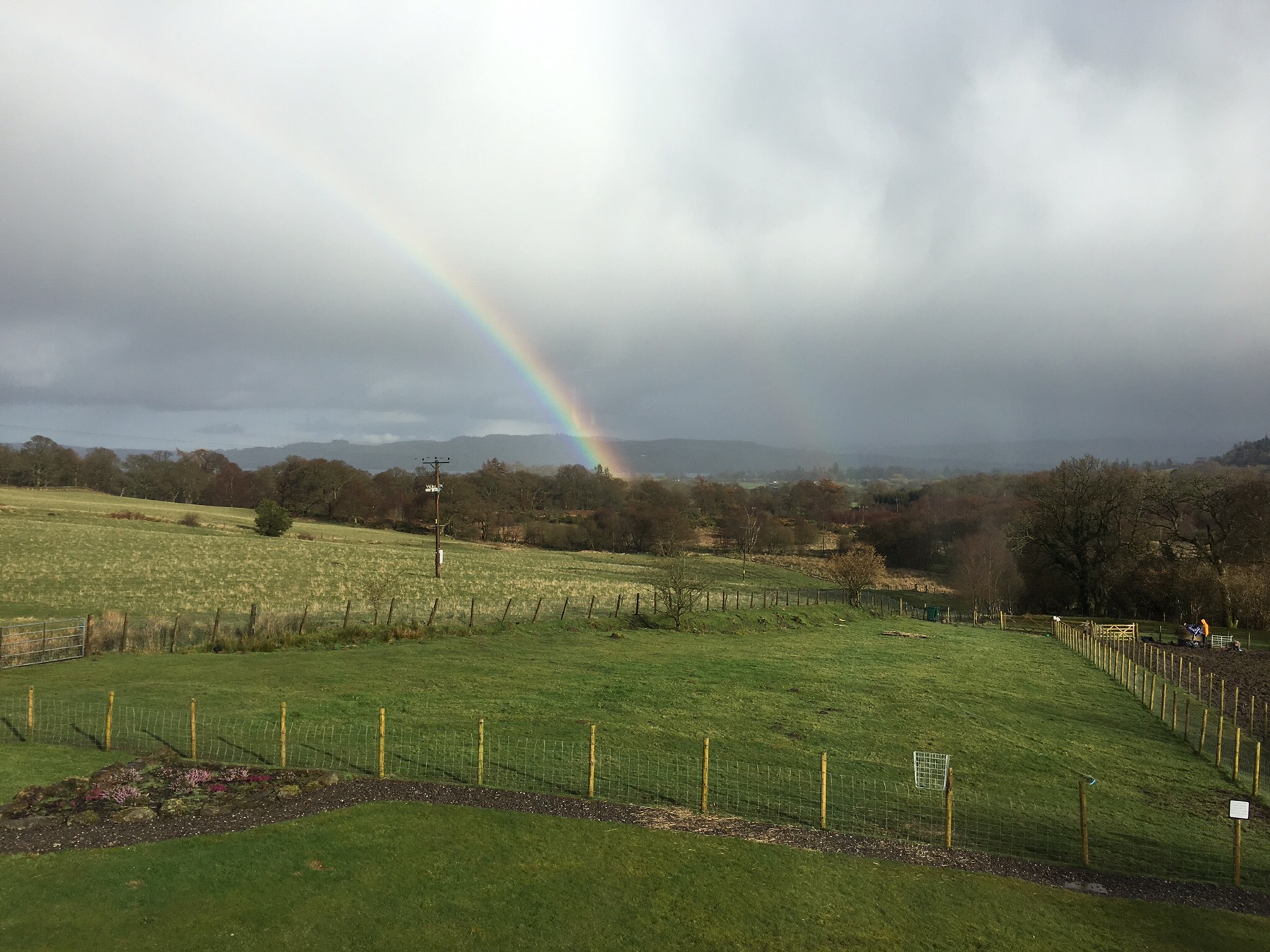 La vue de notre chambre. Un bel arc en ciel en prime, sur le Loch Lomond au loin.