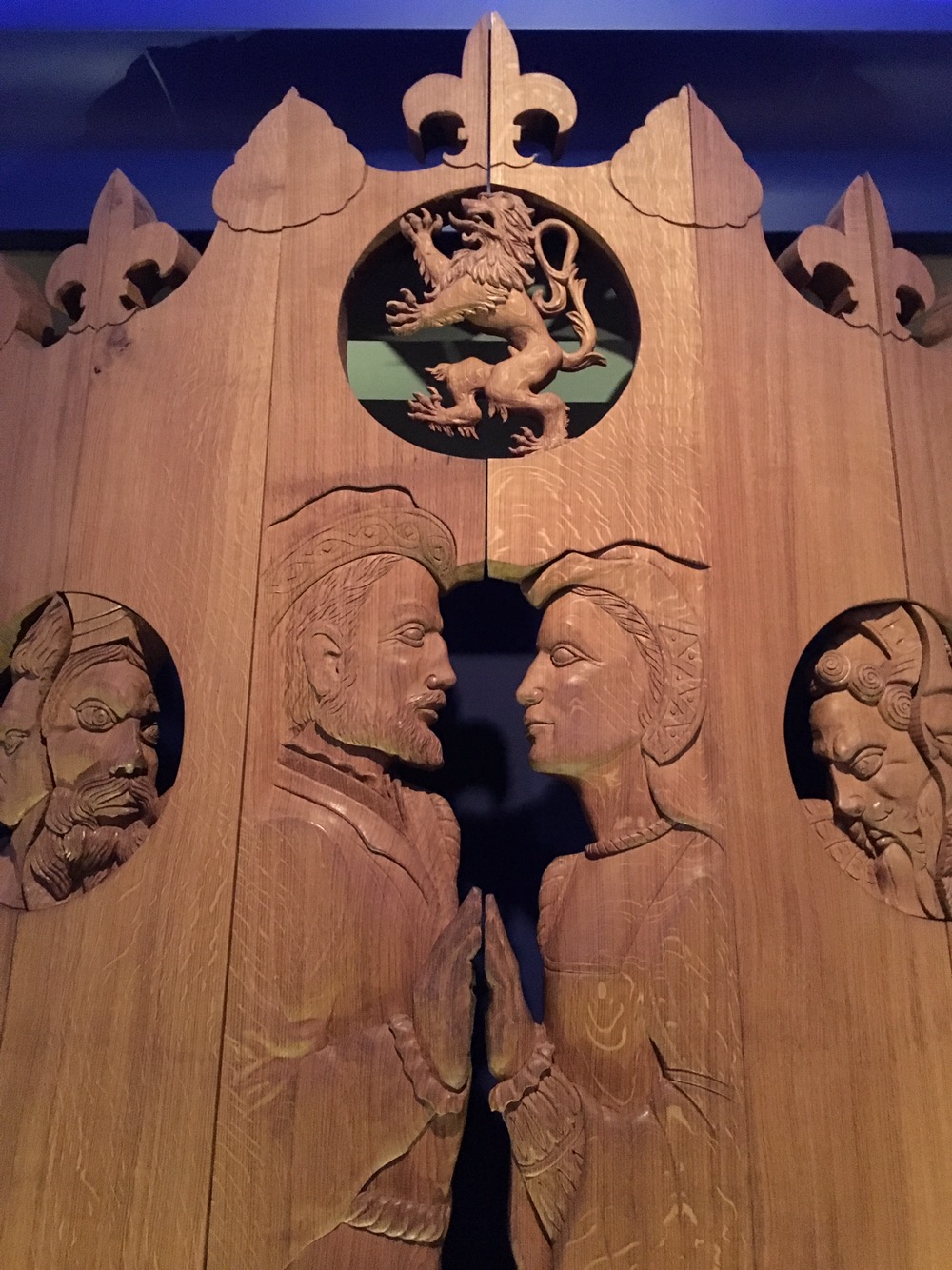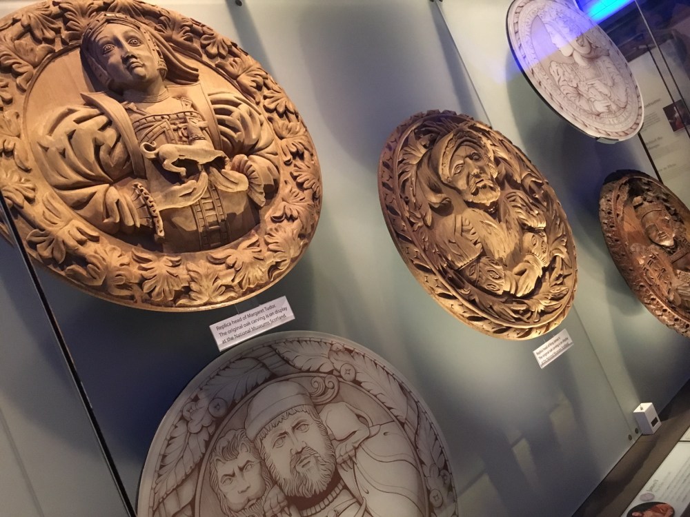 Les portraits en médaillons et autres boiseries sculptées qui ornaient autrefois les plafonds du palais. Ils étaient alors peints de couleurs vives.