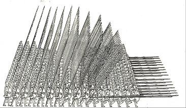 Schéma de carrés de piquiers utilisés lors de la bataille et qui terrassea la chevalerie anglaise. La chevalerie de Robert the Bruce attendait derrière ces schiltrons afin d’attaquer les soldats anglais désormais sans monture. Un troisième rang de soldats, derrière la chevalerie et invisible par l’ennemi, finit d’achever le travail…! Bon, la bataille fut bien sûr un peu plus complexe que cela et je vous invite fortement à lire la page Wikipedia de la bataille pour en connaître tous les détails !