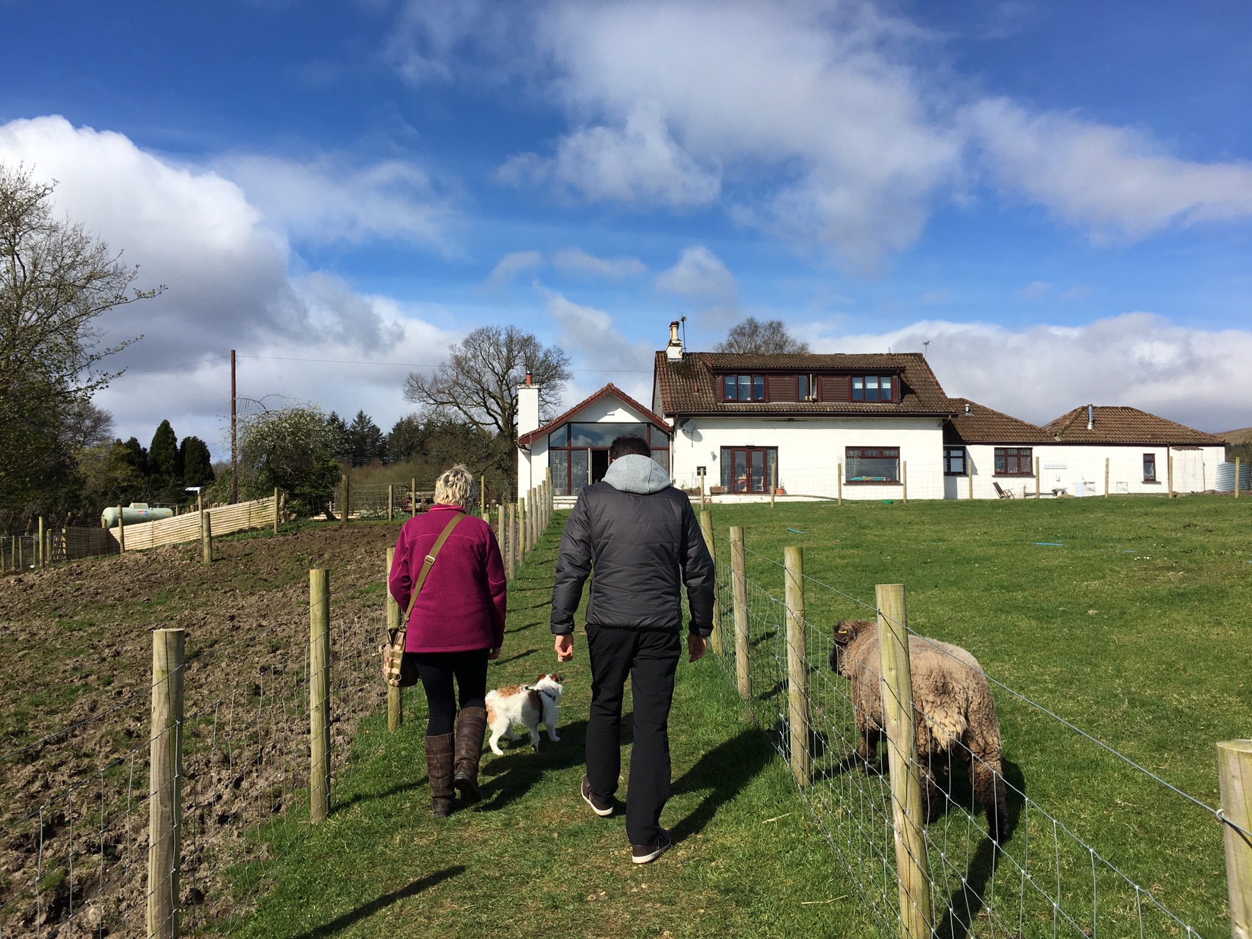 On leur a fait visiter la propriété, accompagné par Velarius le mouton. Il nous suit partout !