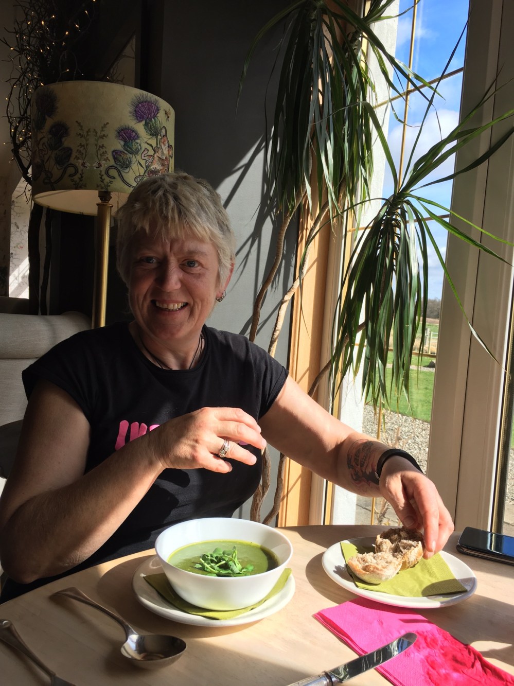Pour la première fois, nous avons déjeuné sur place en tant que clients ! C’était hyper chouette de se faire servir dans la vaisselle qu’on lave tous les jours hihi ! Seonaid a pu découvrir les bons produits de la maison. Ci dessous la soupe du jour : épinards et noix de muscade. Yummy!!
