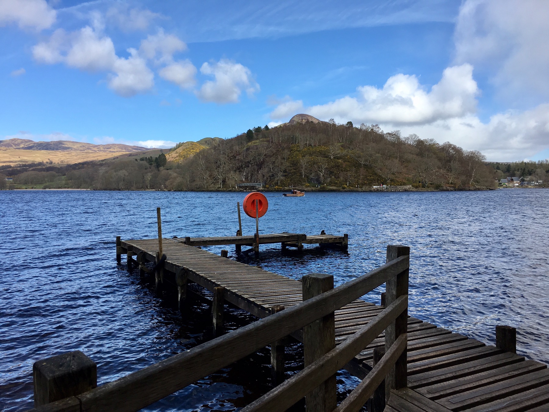 Cricri et Yves reconnaîtrons l’endroit, nous y avions fait une balade ensemble en février. C’est là qu’on peut prendre un petit bateau, à la demande, pour rejoindre l’île de Inchcailloch. Trop cooooool !