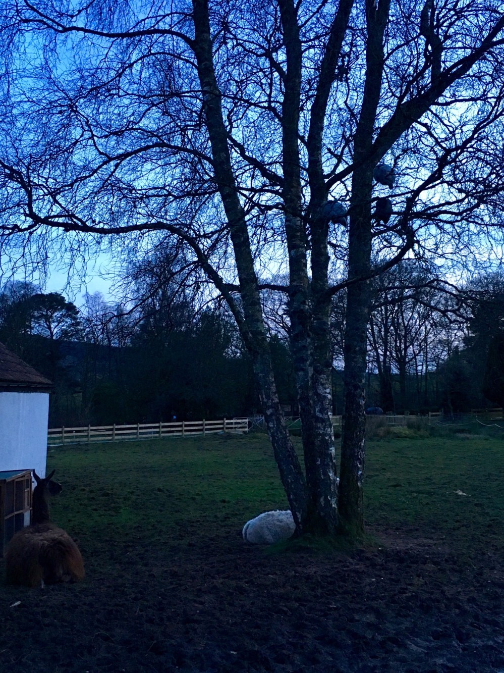 Arrivez vous à distinguer les masses grises dans cet arbre ? Ce sont les pintades qui dorment !