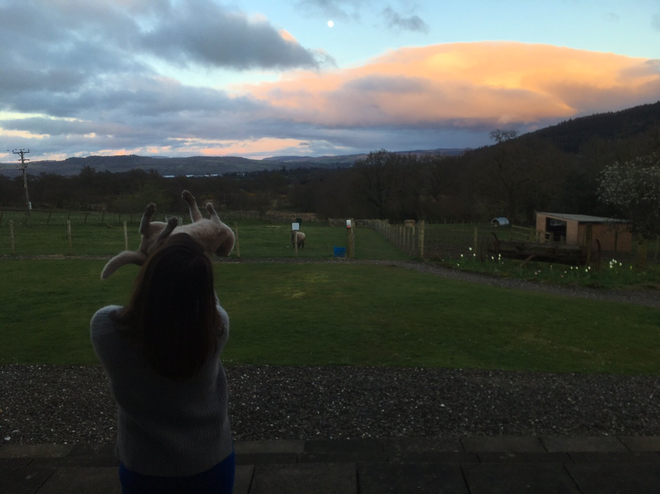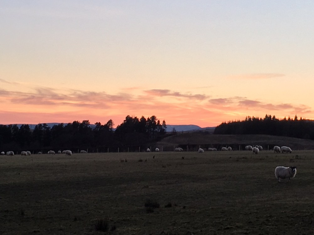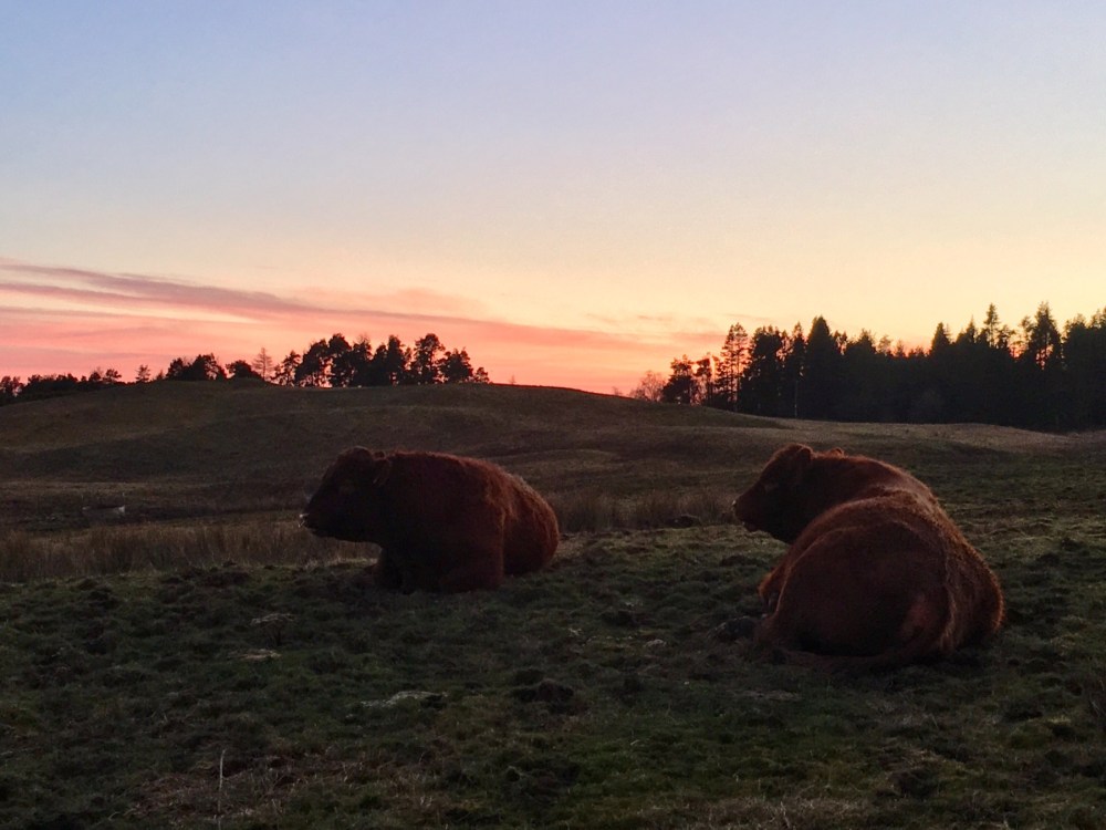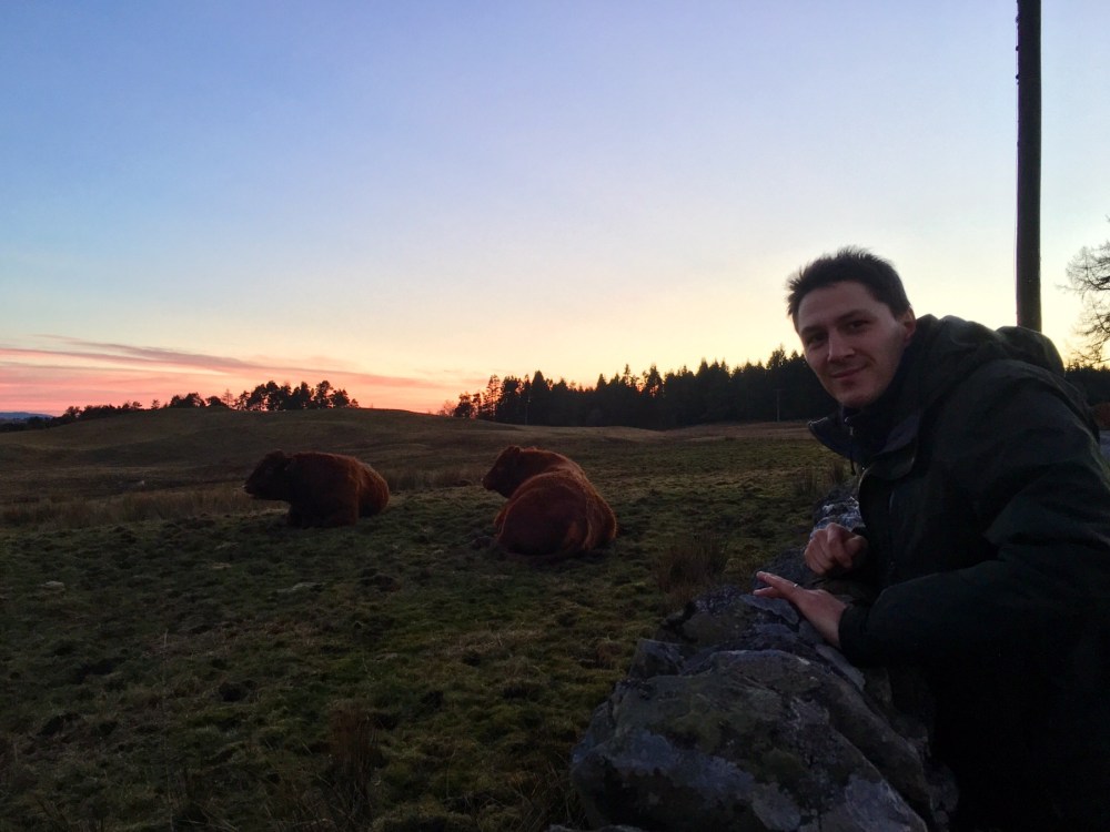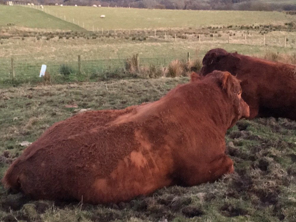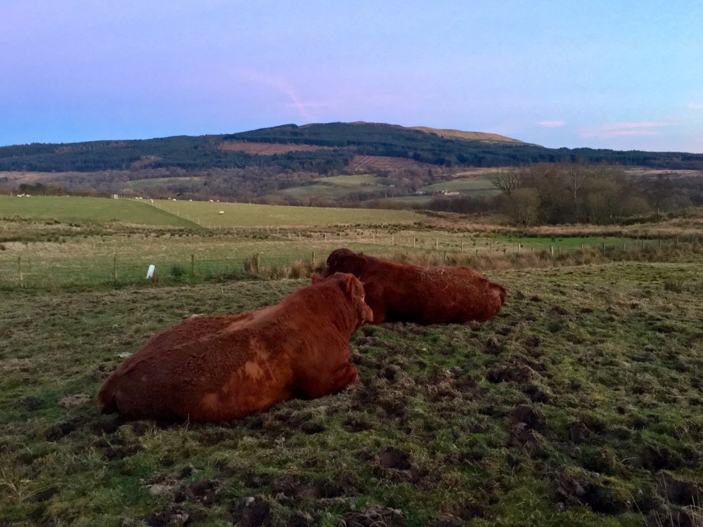 Balade du soir en haut de la colline de Glen Fruin. Lueurs de printemps et observation de la faune locale… où les taureaux ressemblent à des hippopotames !