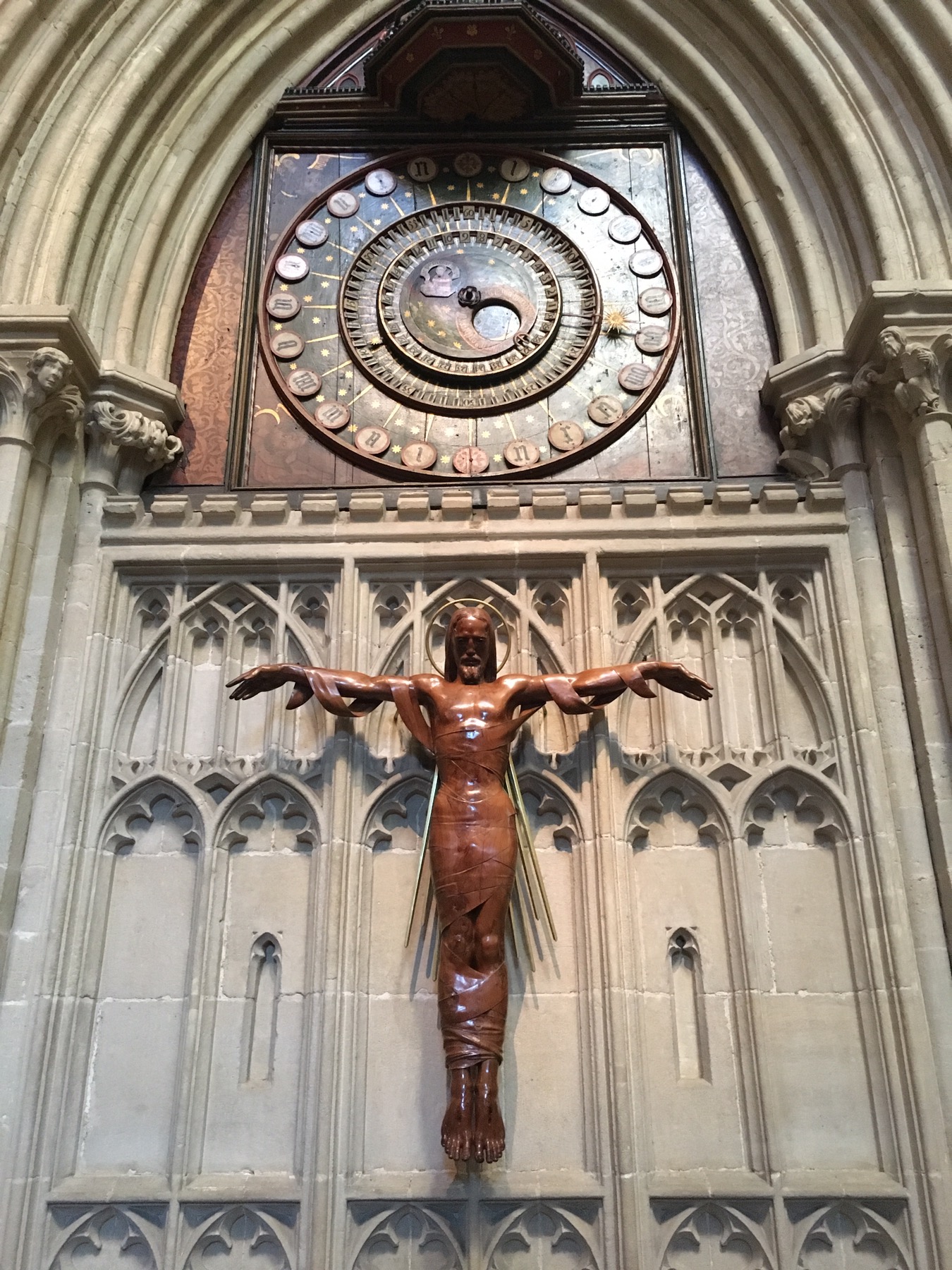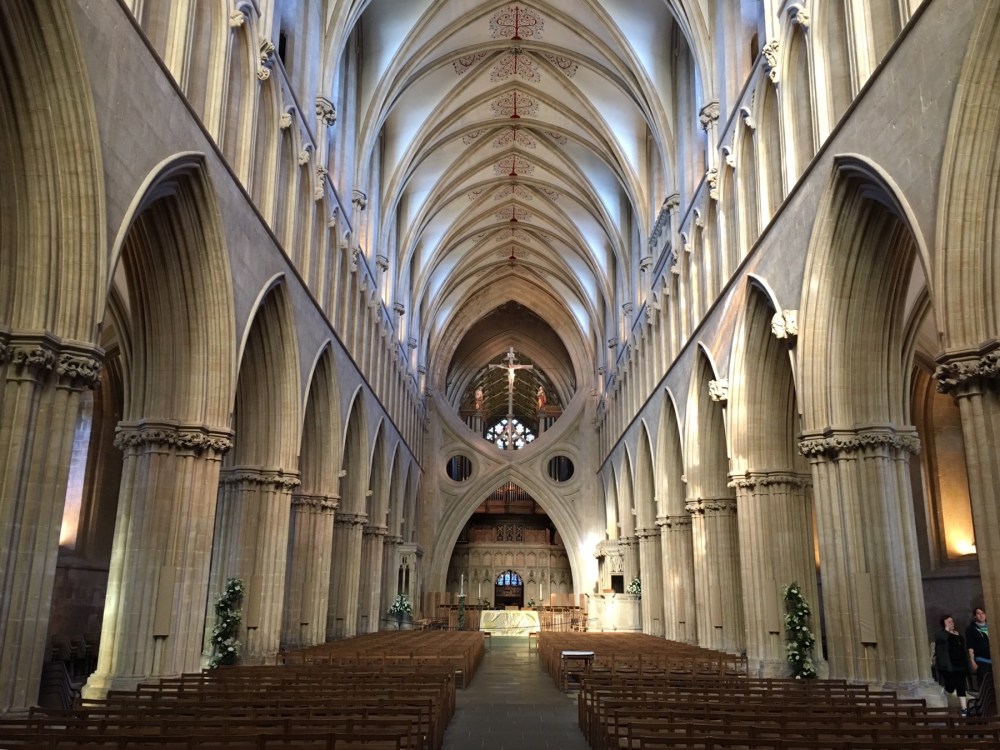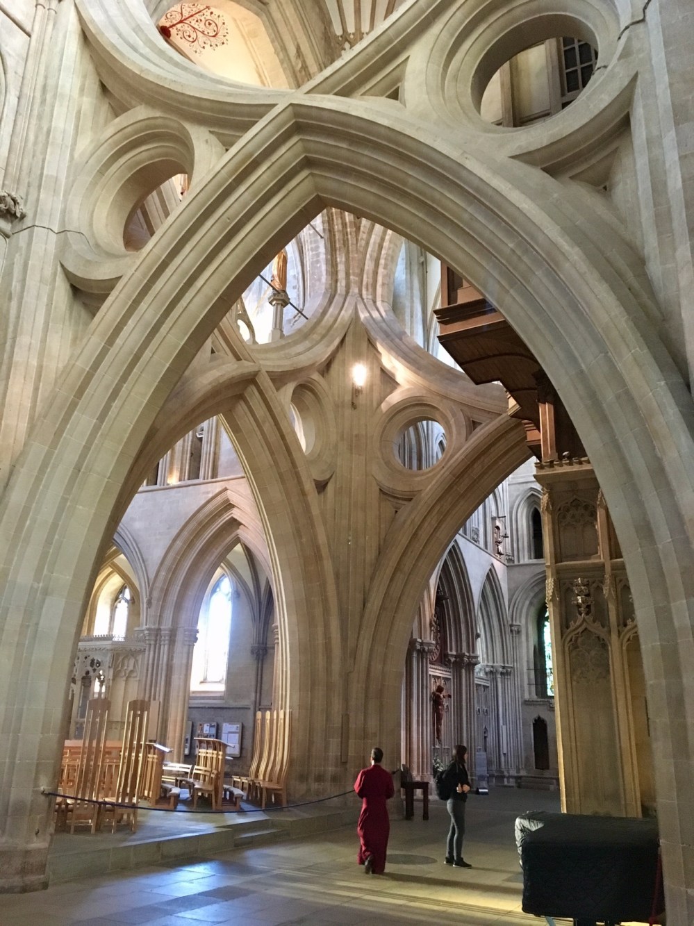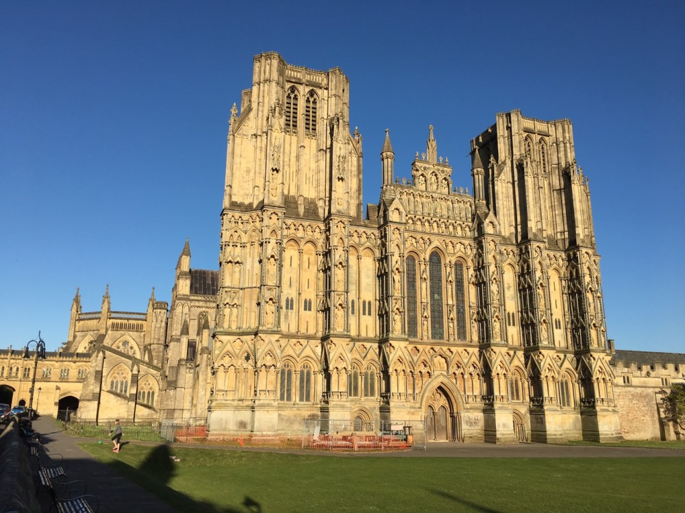 Wow. Observez les statues qui ornent toute cette façade ! Elles se comptent au nombre de 300 et datent de 1230, racontant les épisodes des Ancien et Nouveau Testaments ! Nous sommes en face de la Cathédrale de Wells, Saint Andrew’s cathedral, à une dizaine de kilomètres de Glastonbury. Connue comme l’une des plus belles cathédrales d’Angleterre, le début de sa construction débuta en 1180 et ne s’acheva qu’au XVIe siècle. Un petit bijou !