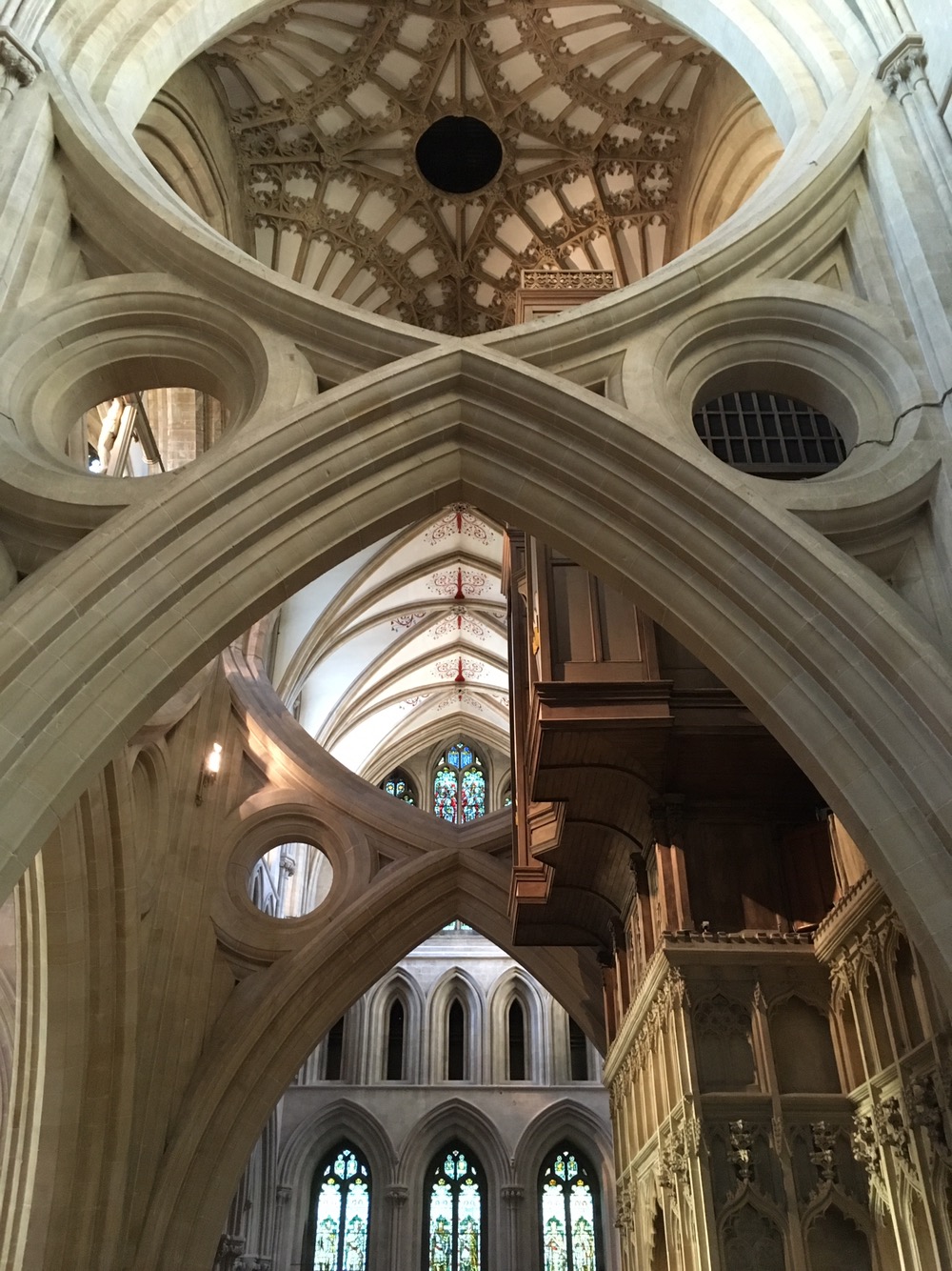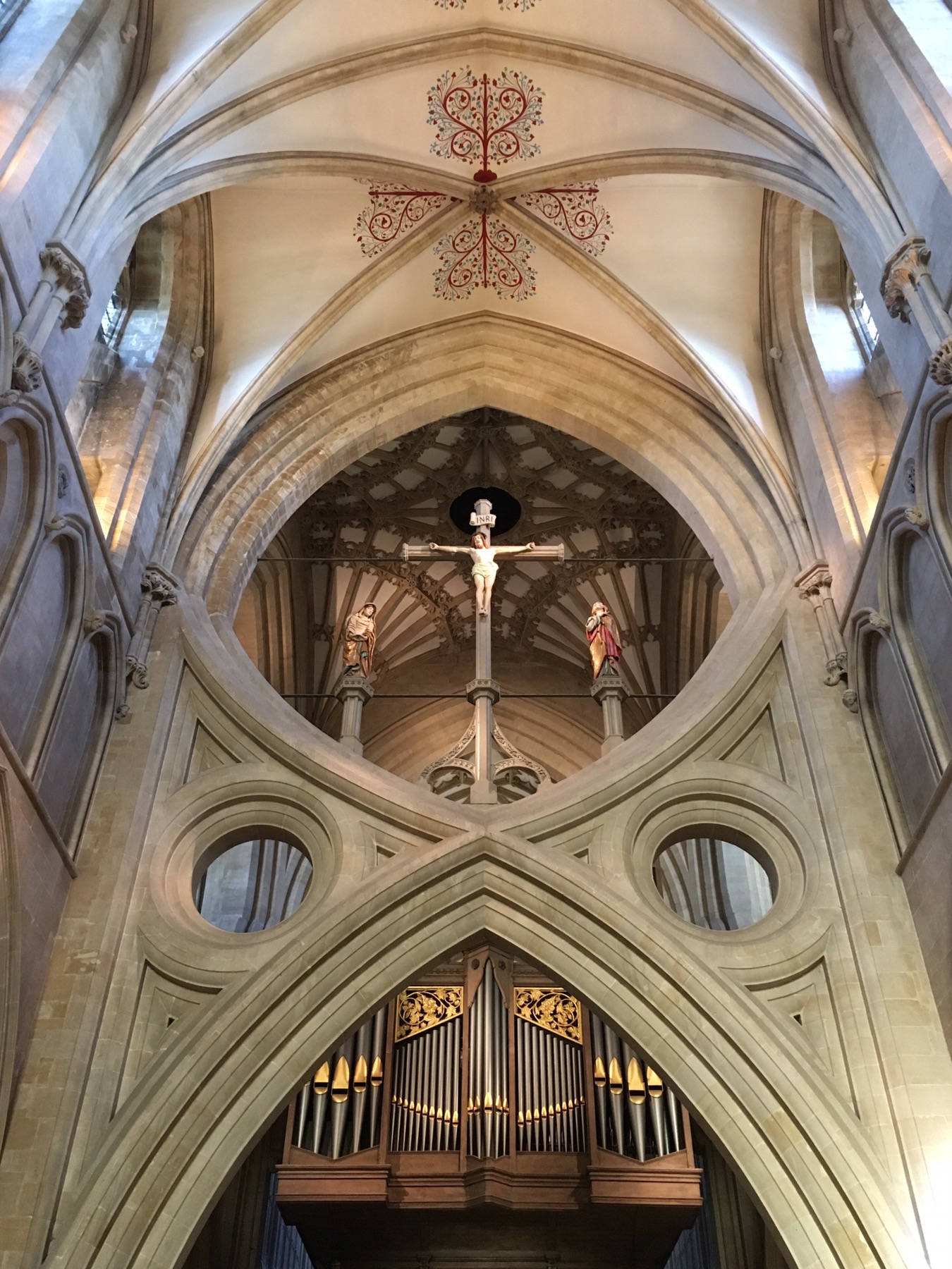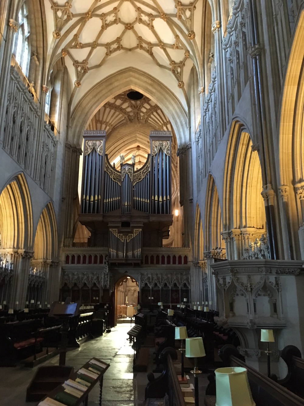 Wow. Observez les statues qui ornent toute cette façade ! Elles se comptent au nombre de 300 et datent de 1230, racontant les épisodes des Ancien et Nouveau Testaments ! Nous sommes en face de la Cathédrale de Wells, Saint Andrew’s cathedral, à une dizaine de kilomètres de Glastonbury. Connue comme l’une des plus belles cathédrales d’Angleterre, le début de sa construction débuta en 1180 et ne s’acheva qu’au XVIe siècle. Un petit bijou !