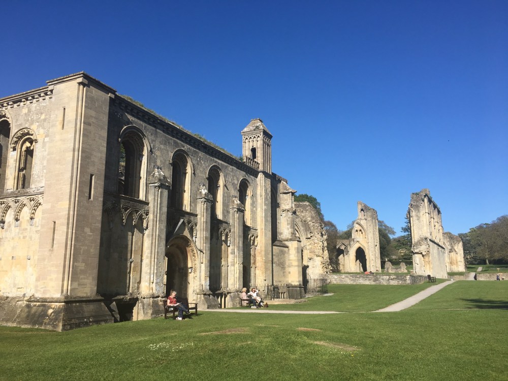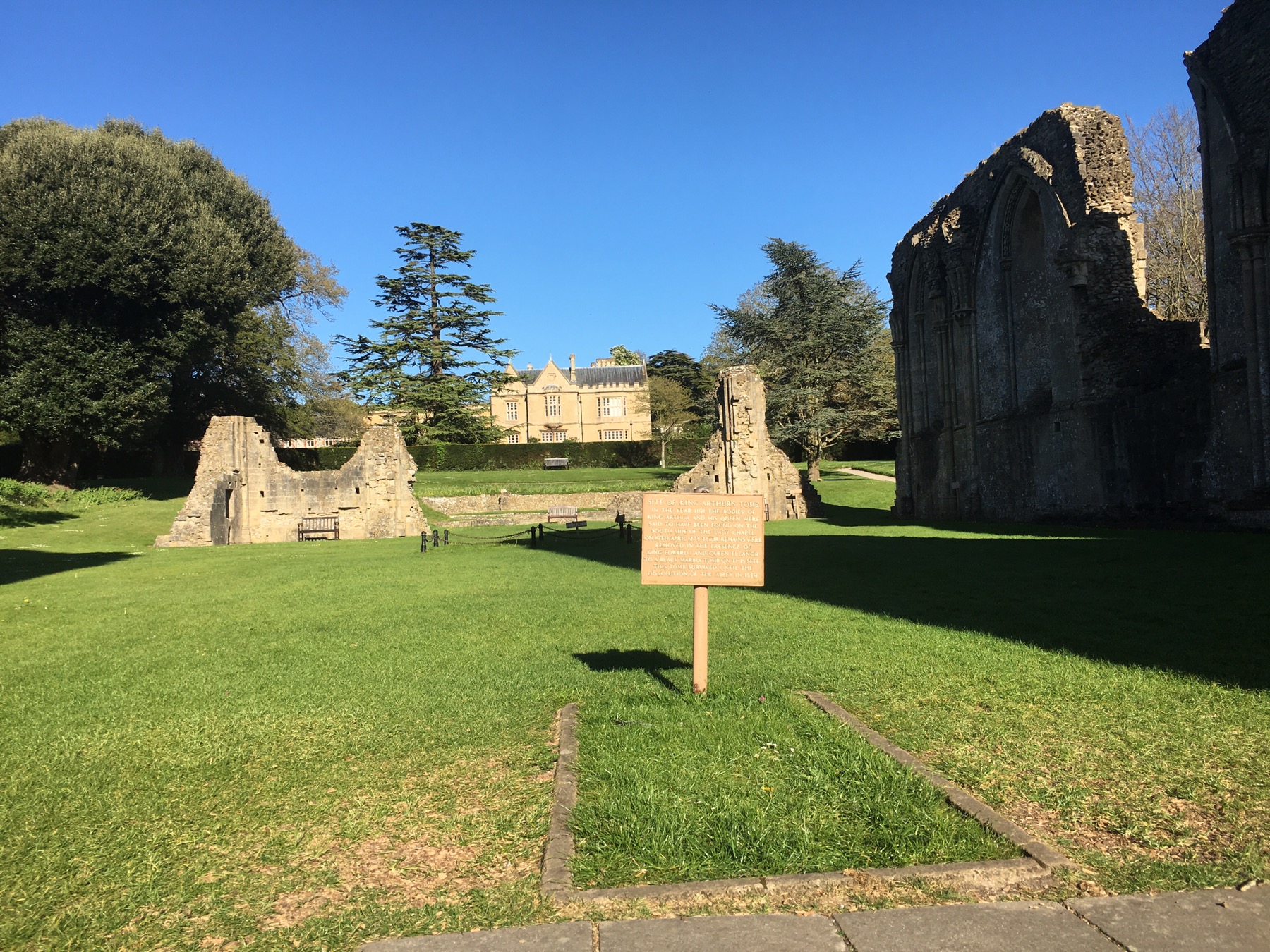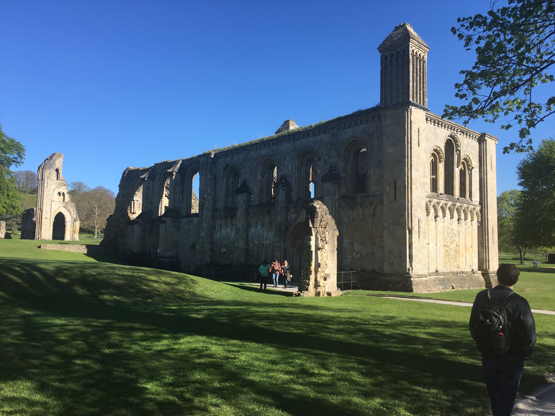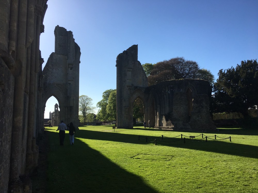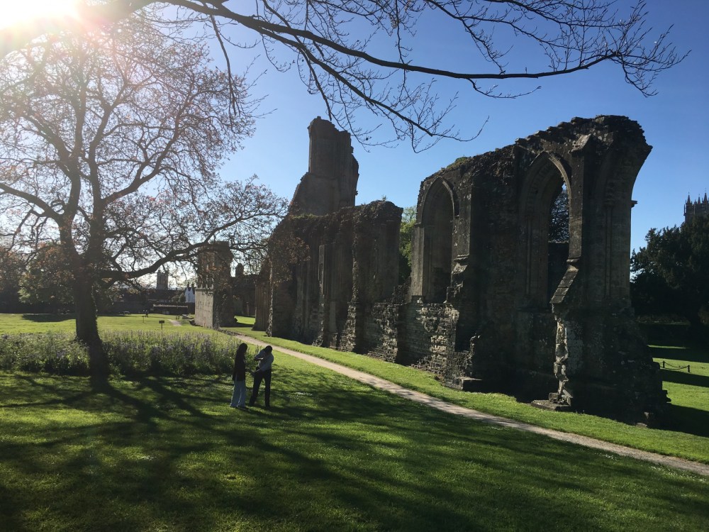 Nous voici sur le site de Glastonbury Abbey, véritable havre de paix au centre de la ville. La quiétude et la spiritualité du lieu (et la douceur printanière aussi, nous ne le nions pas !) nous ont totalement envoûtés. Berceau du christianisme en Angleterre, l’abbaye fut fondée en l’an 700 par des moines qui ne démentirent jamais les légendes associant Glastonbury au Roi Arthur, sa femme Guenièvre et le Saint Graal. Ca tombe bien car les prétendues tombes des deux époux ont été retrouvées en 1191 et officialisées par une gigantesque inhumation en 1298. Le sanctuaire ne cessa d’agrandir sa renommée et ses bâtiments à partir de cette date… pour s’arrêter en 1539 avec Henri VIII et la Réforme protestante. Devenue carrière de pierres de construction ensuite, active jusqu’au XIXe siècle, l’abbaye, miraculeusement, nous offre encore de quoi imaginer sa magnificience de l’époque.