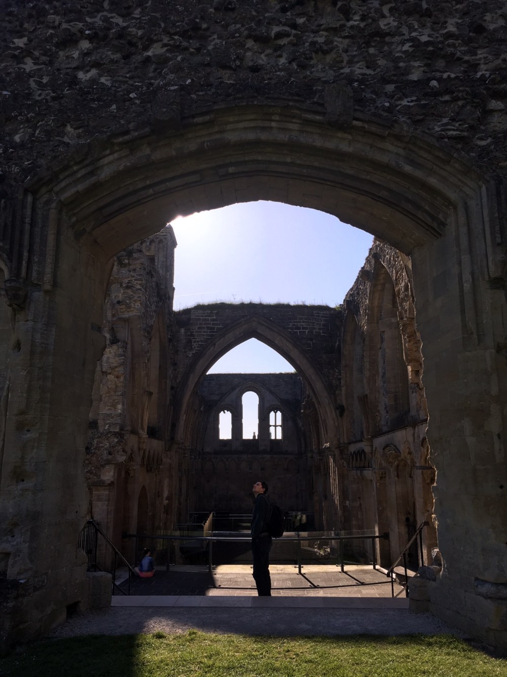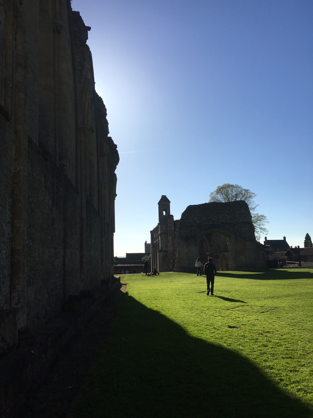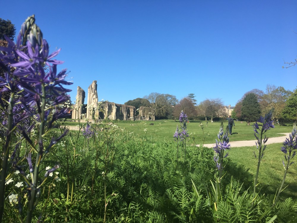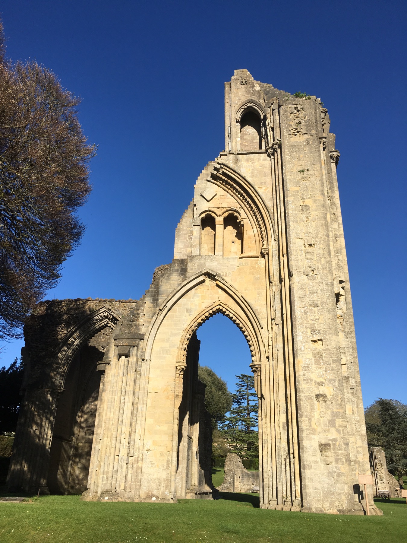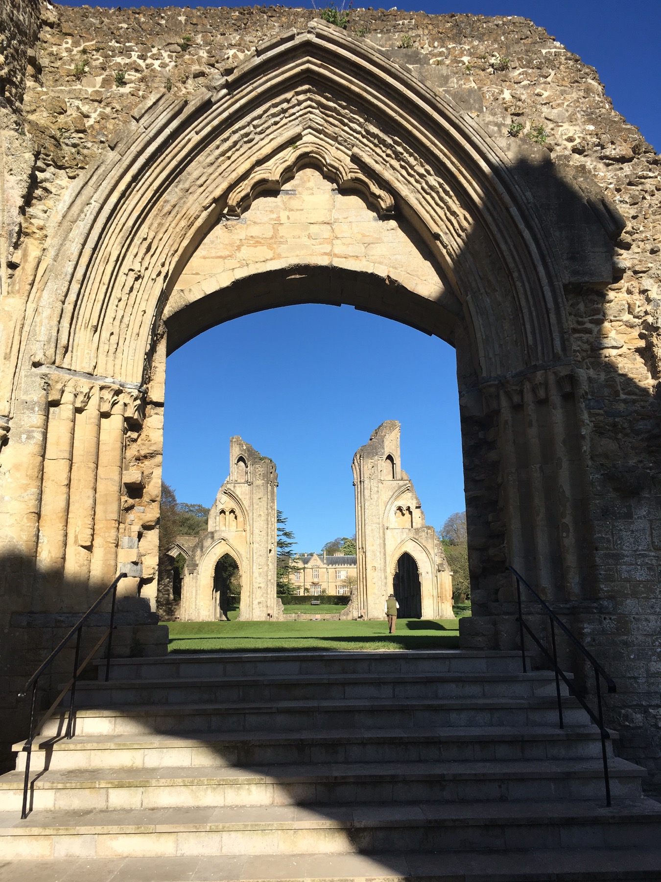 Nous voici sur le site de Glastonbury Abbey, véritable havre de paix au centre de la ville. La quiétude et la spiritualité du lieu (et la douceur printanière aussi, nous ne le nions pas !) nous ont totalement envoûtés. Berceau du christianisme en Angleterre, l’abbaye fut fondée en l’an 700 par des moines qui ne démentirent jamais les légendes associant Glastonbury au Roi Arthur, sa femme Guenièvre et le Saint Graal. Ca tombe bien car les prétendues tombes des deux époux ont été retrouvées en 1191 et officialisées par une gigantesque inhumation en 1298. Le sanctuaire ne cessa d’agrandir sa renommée et ses bâtiments à partir de cette date… pour s’arrêter en 1539 avec Henri VIII et la Réforme protestante. Devenue carrière de pierres de construction ensuite, active jusqu’au XIXe siècle, l’abbaye, miraculeusement, nous offre encore de quoi imaginer sa magnificience de l’époque.