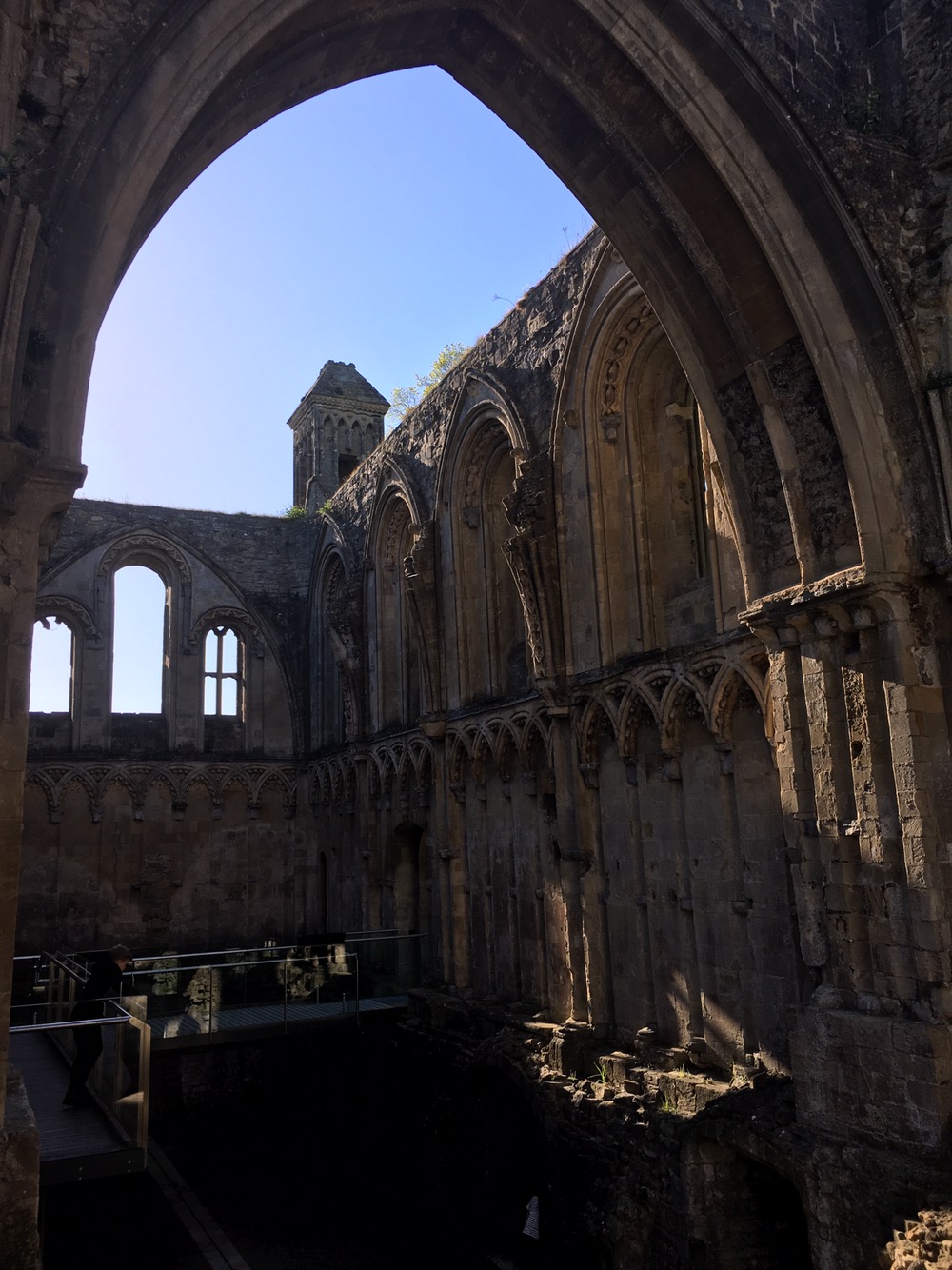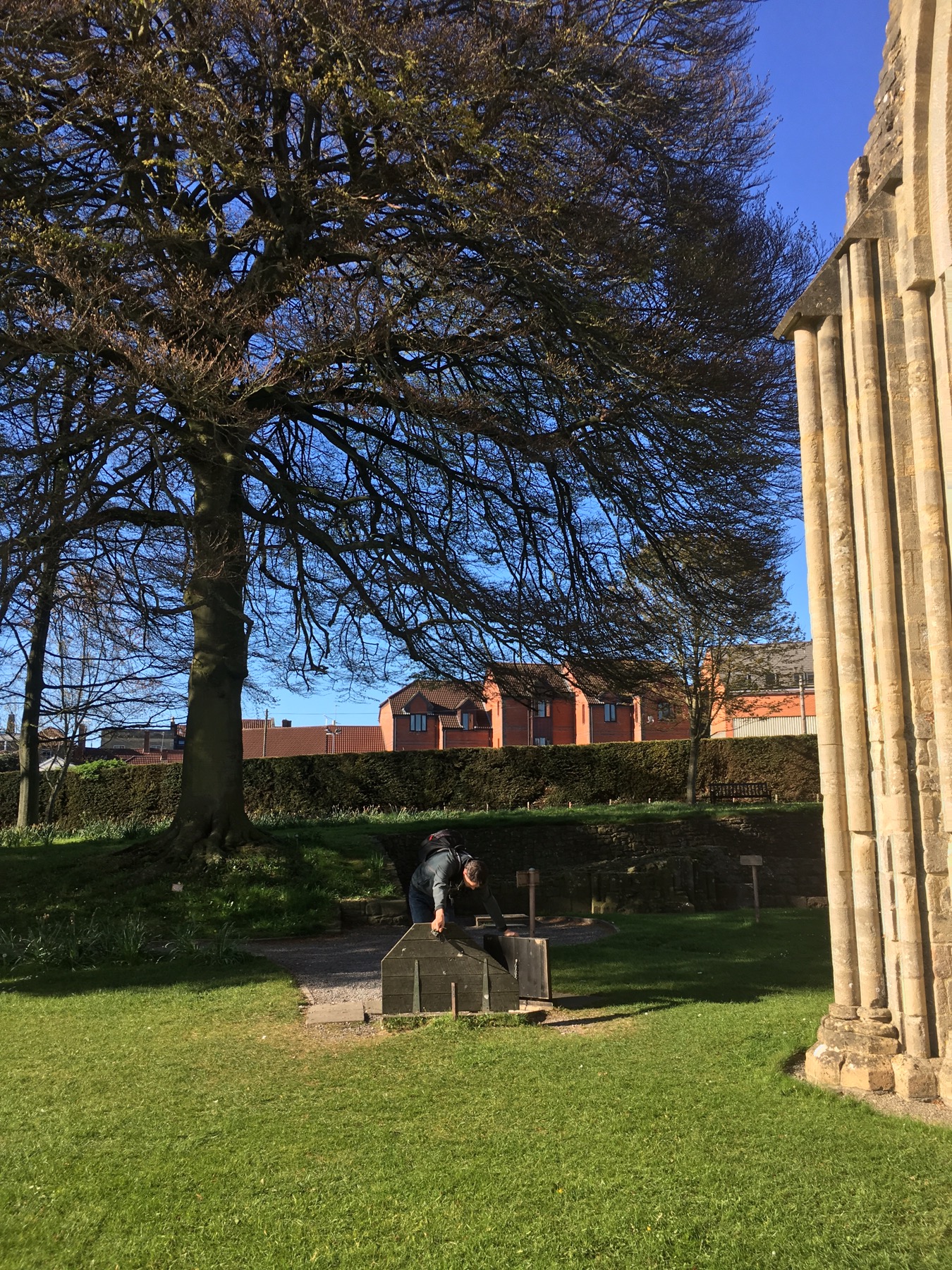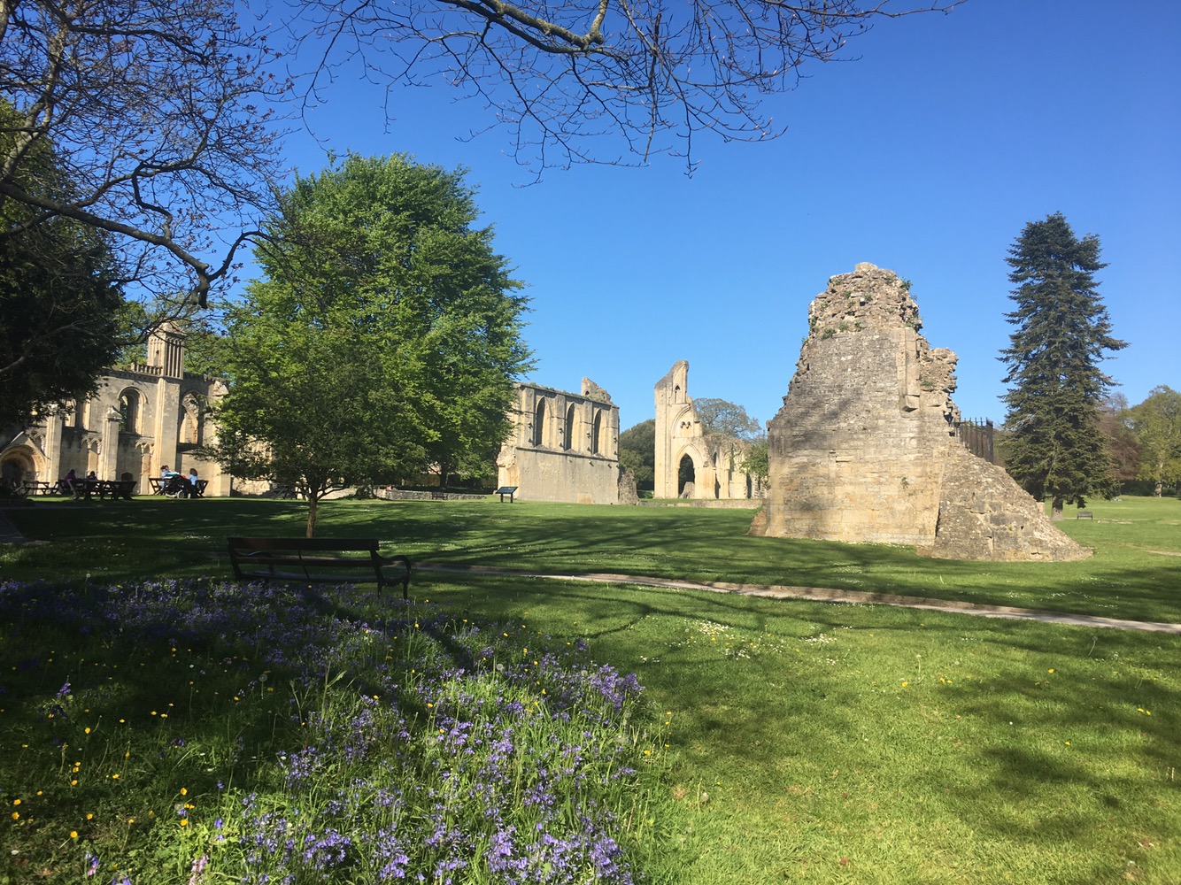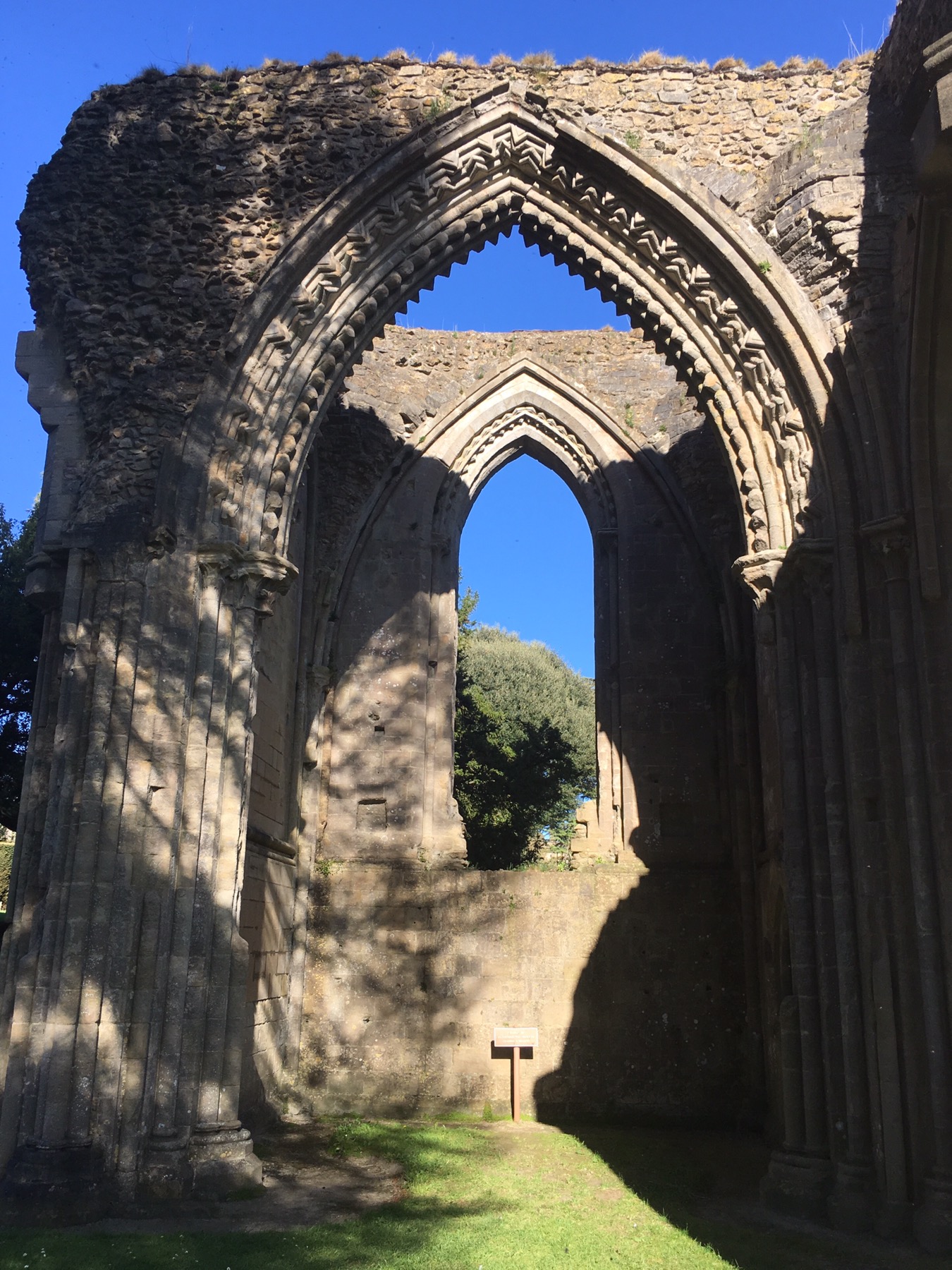 Nous voici sur le site de Glastonbury Abbey, véritable havre de paix au centre de la ville. La quiétude et la spiritualité du lieu (et la douceur printanière aussi, nous ne le nions pas !) nous ont totalement envoûtés. Berceau du christianisme en Angleterre, l’abbaye fut fondée en l’an 700 par des moines qui ne démentirent jamais les légendes associant Glastonbury au Roi Arthur, sa femme Guenièvre et le Saint Graal. Ca tombe bien car les prétendues tombes des deux époux ont été retrouvées en 1191 et officialisées par une gigantesque inhumation en 1298. Le sanctuaire ne cessa d’agrandir sa renommée et ses bâtiments à partir de cette date… pour s’arrêter en 1539 avec Henri VIII et la Réforme protestante. Devenue carrière de pierres de construction ensuite, active jusqu’au XIXe siècle, l’abbaye, miraculeusement, nous offre encore de quoi imaginer sa magnificience de l’époque.