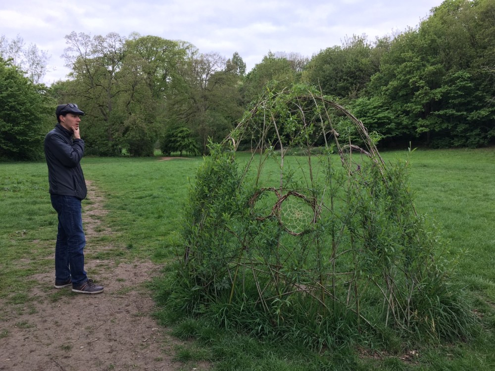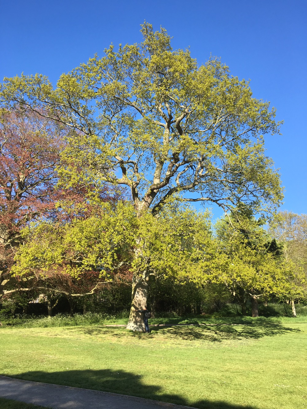 Simon offre un hug à l’un des grands arbres du parc 🌳