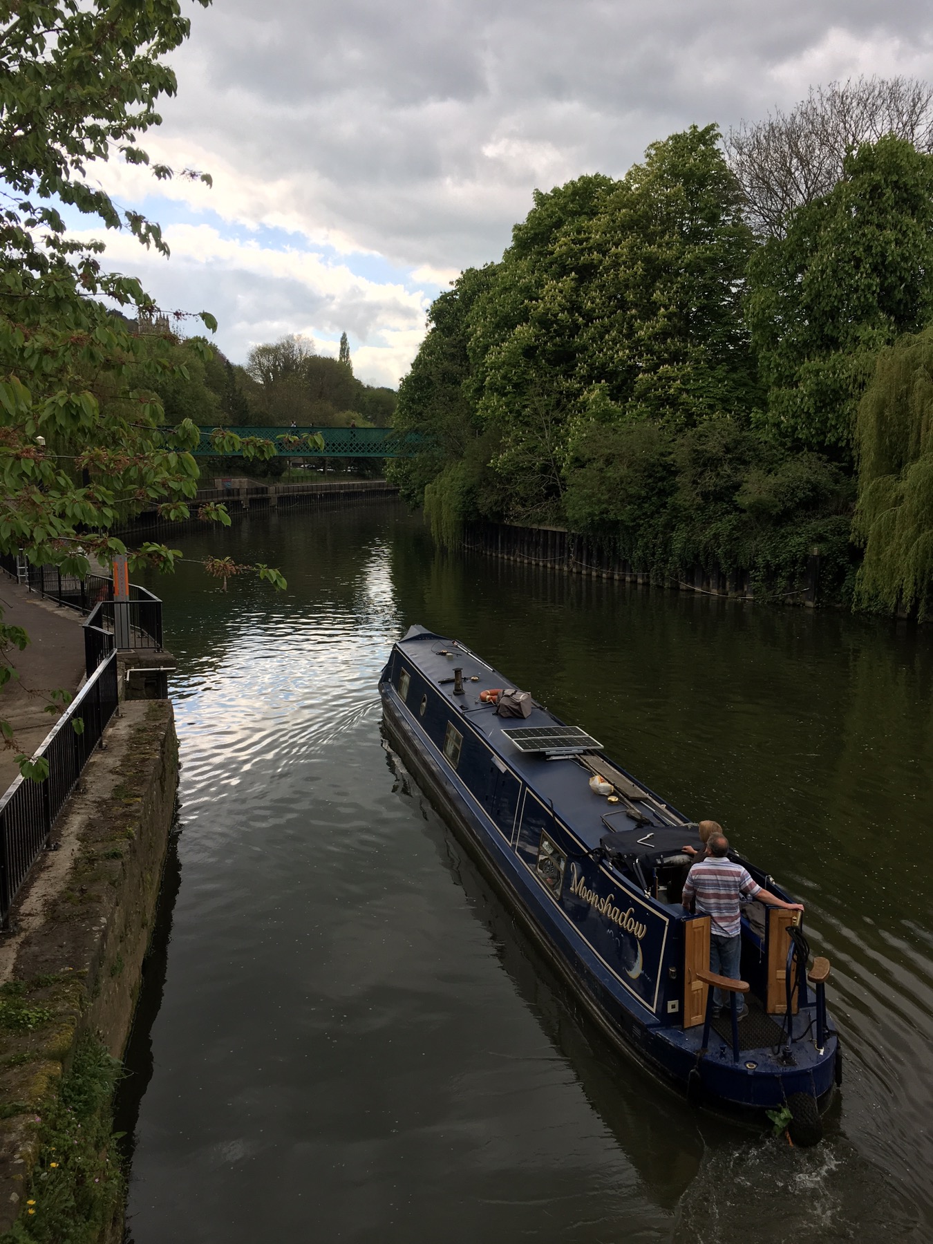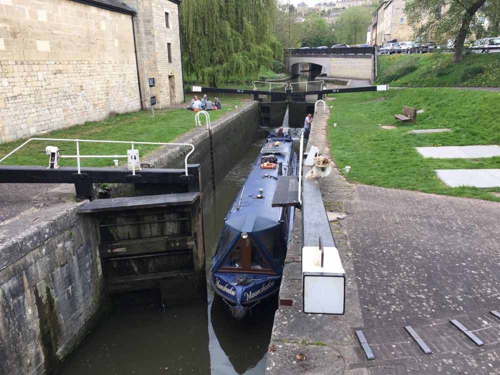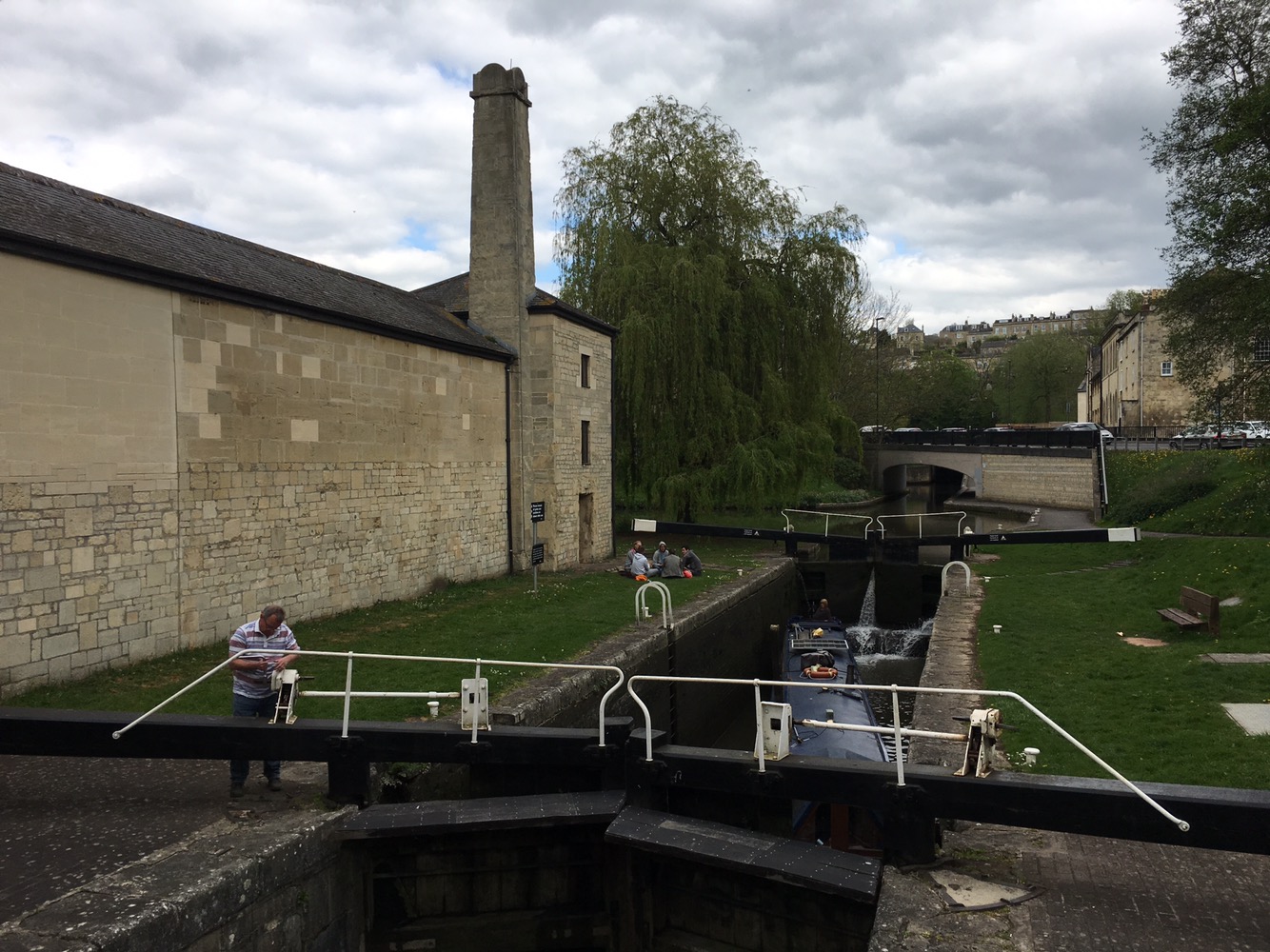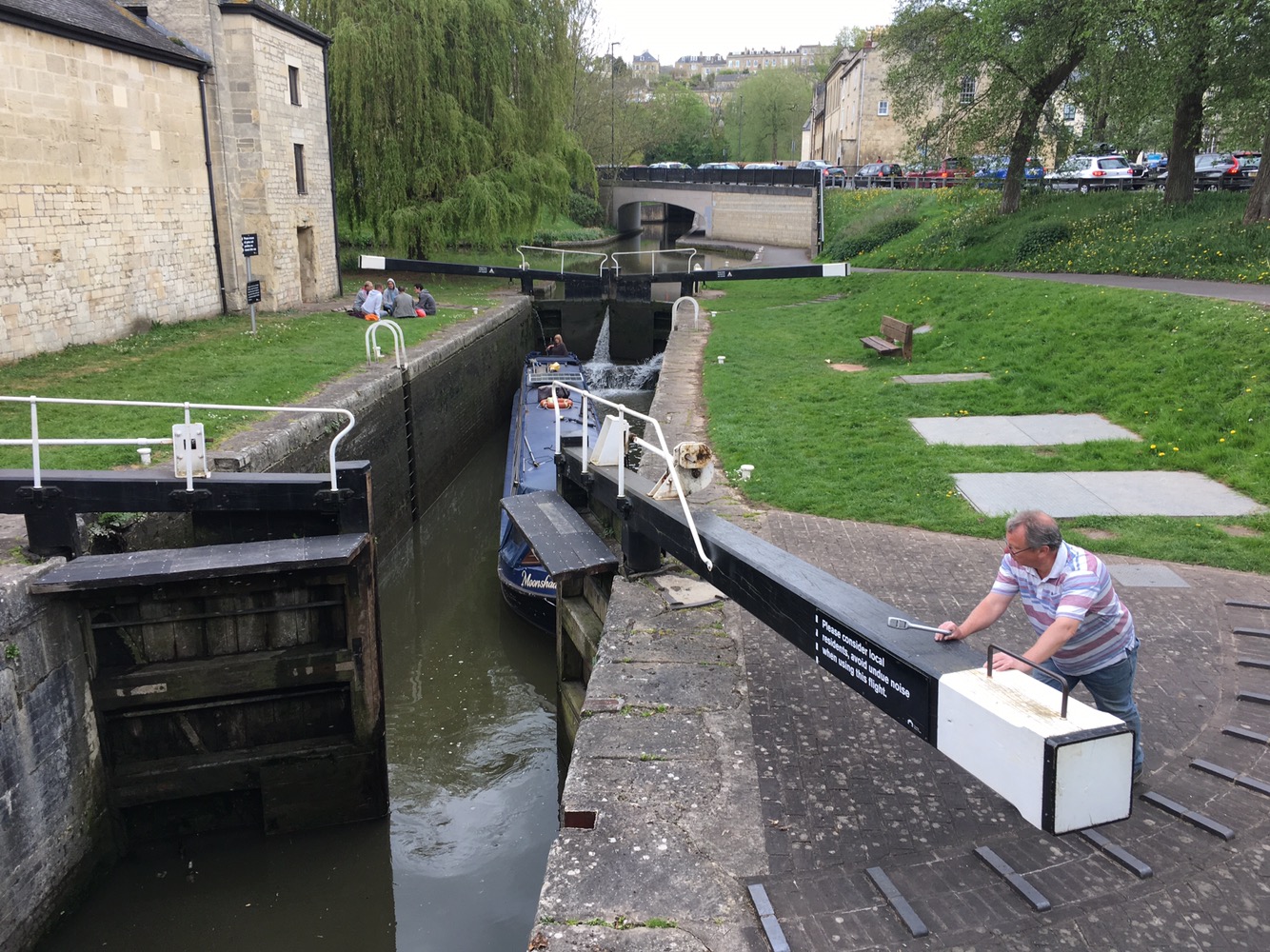 …puis le long du canal de Bath, entièrement aménagé pour les piétons, cyclistes et même les chevaux ! Il est possible de rejoindre Bristol par cette voie… ou en péniche comme ce couple manoeuvrant pour passer une écluse.