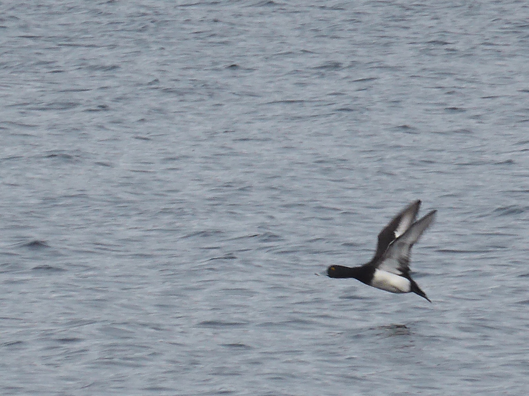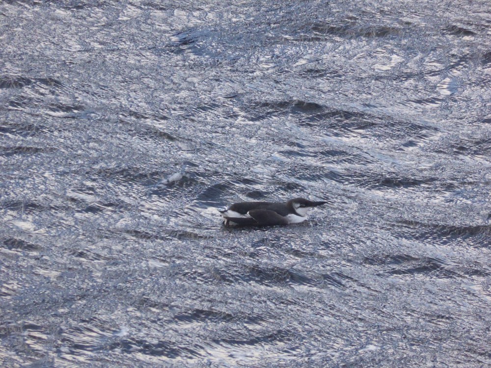 Il s’agit d’un guillemot de troïl avec son plumage internupsial (sur cette photo il a le tour des yeux blanc comme des lunettes ; cela n’est pas habituel dans cette région, normalement il faut être bien plus au nord. Déduction : il est sûrement arrivé récemment)