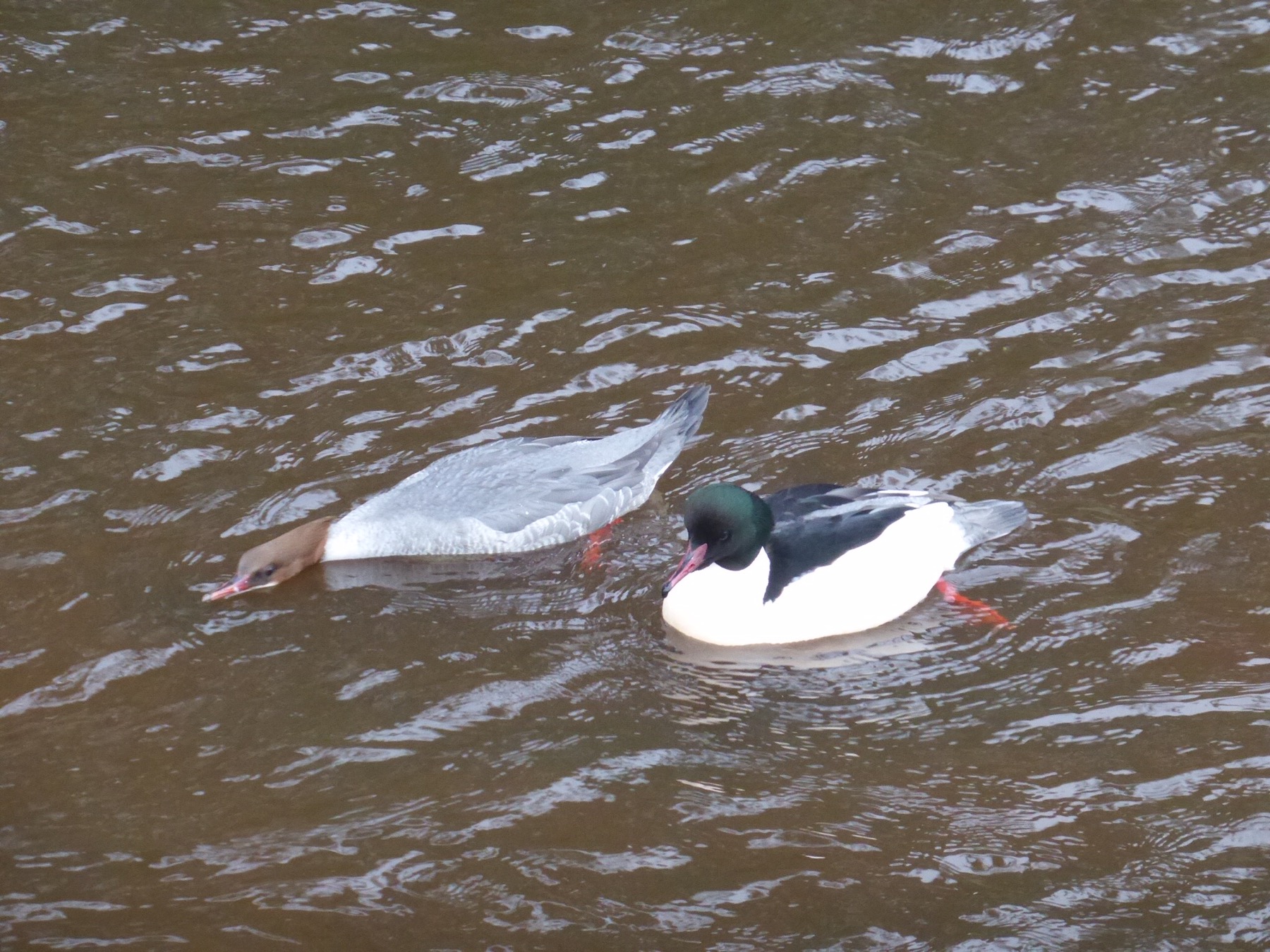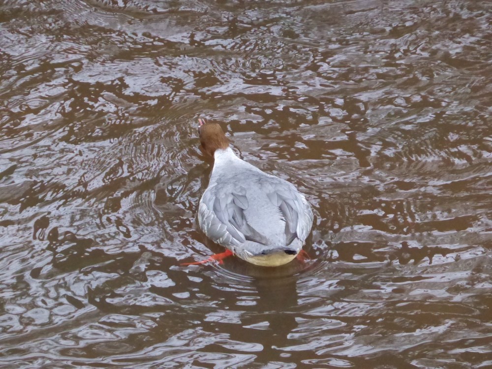 Oiseau 4 : voici un couple de harles bièvre que nous avons observés à Edimbourg. Au moment de la photo le mâle (tête brune) s’est mis à plat ventre sans bouger, comportement très rigolo à observer.
