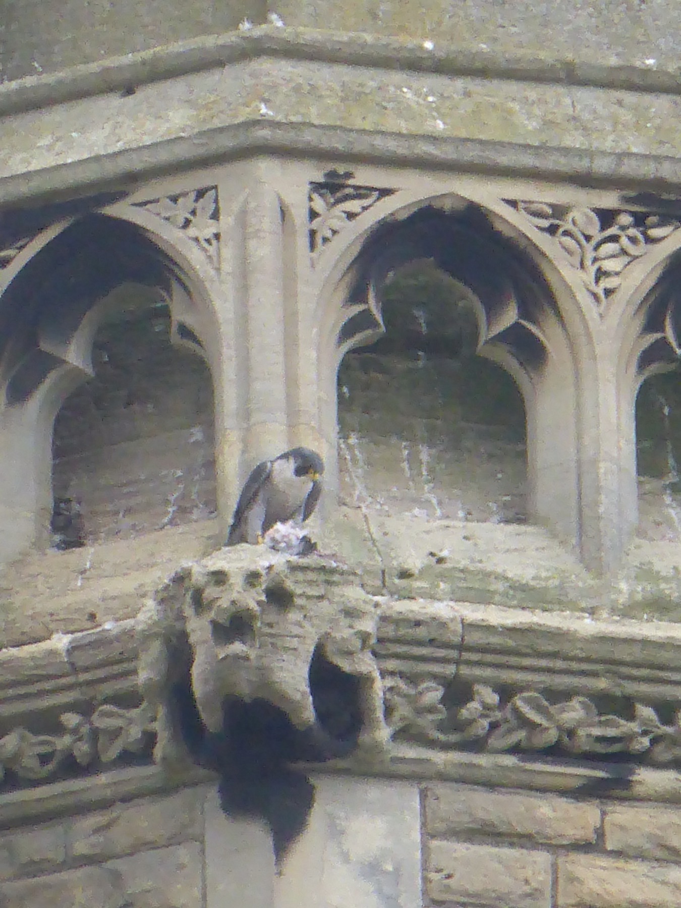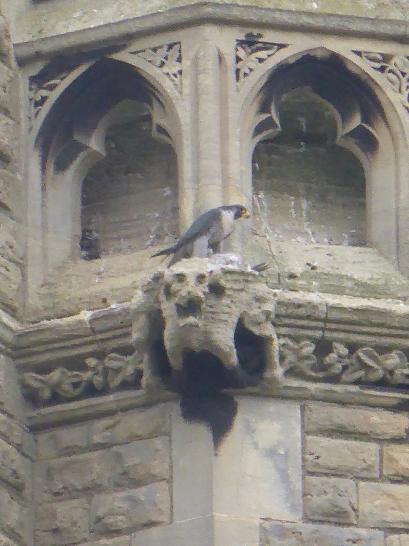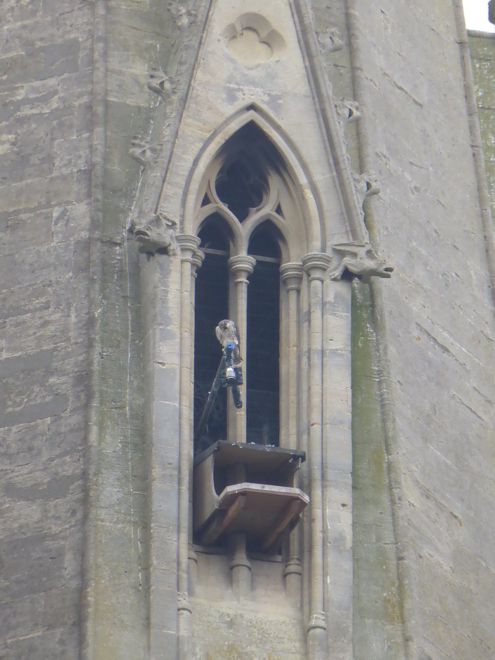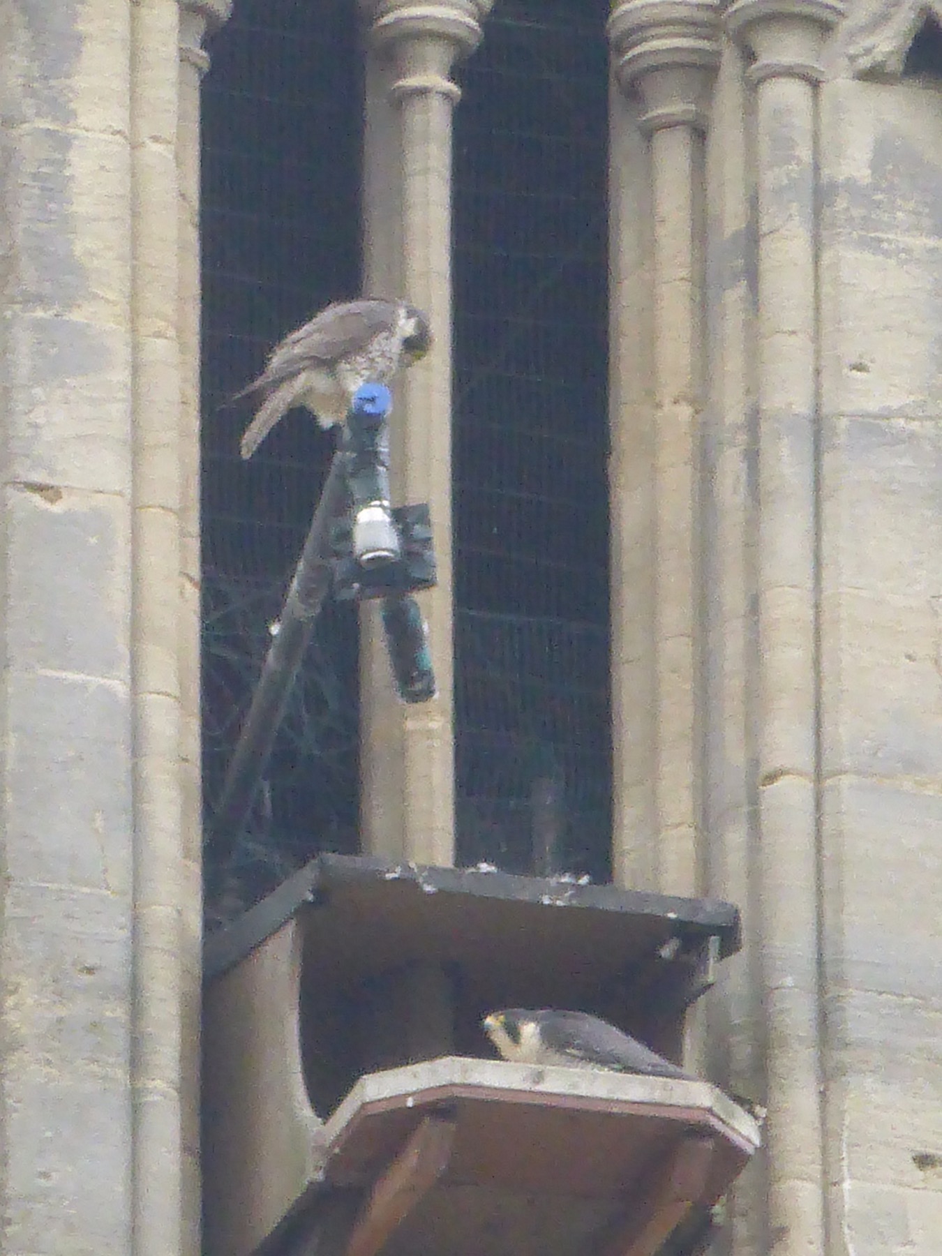 Voici leur nid. Les faucons pélerins s’occupent de préserver l’église des mouettes et autre oiseau qui serait susceptible de la dégrader. Et ça marche ! À la moindre approche, les faucons décollent et ça bagarre !