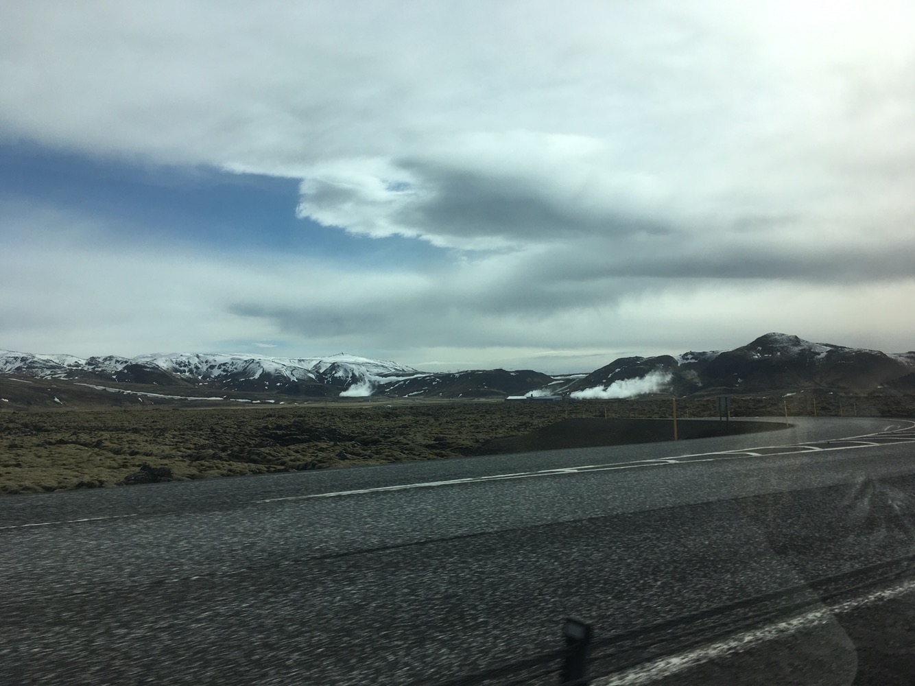 À l’aéroport, nous avons rapidement récupéré nos valises et trouvé le bus pour rejoindre le centre de Reykjavik. Jusque là, pas de difficulté particulière. Nous profitons des 45mn de route pour feuilleter les prospectus d’activités touristiques islandaises. Nous n’en ferons probablement aucune puisqu’une simple visite de grotte de glace coûte près de 90€/pers. et il s’agirait d’une des activités les moins chères… J’avais pensé offrir un tour en hélicoptère à Simon pour son anniversaire mais il nous en coûterait près de 800€ pour une demie-heure de vol…! Pas grave, on le savait, et la nature islandaise a des milliers de choses gratuites à nous offrir ! On admire aussi les tous premiers paysages et apercevons déja des fumerolles s’échapper des montagnes enneigées au loin. Les abords ne sont que steppe, terres brûlées et roches volcaniques. Hypnotisant.