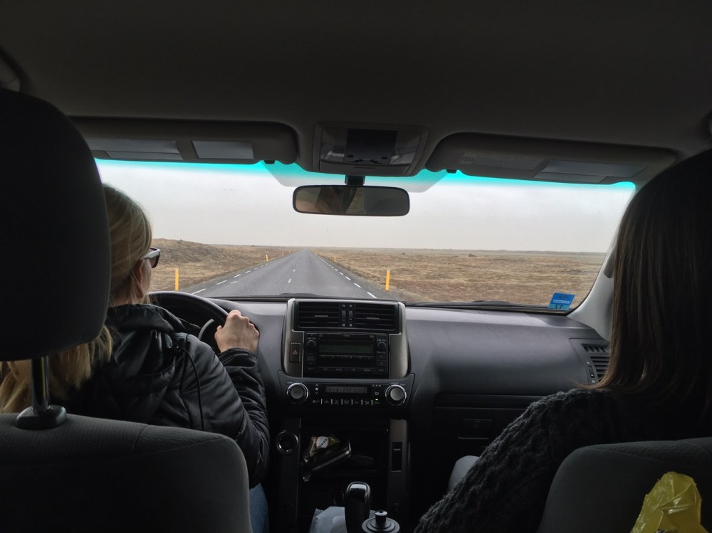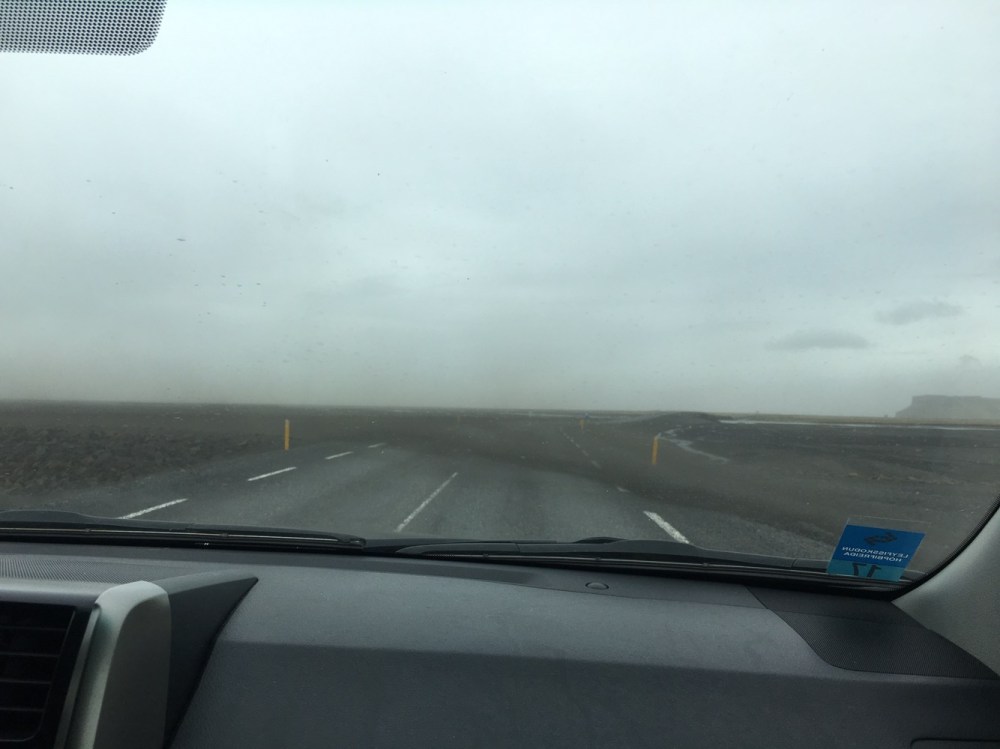 Les paysages défilent. Plaines, montagnes vertigineuses, cascades, étendues d’eau, fumerolles inquiétantes… Puis viennent les plages de sable noir… et le vent qui se fait de plus en plus fort et déporte légèrement notre gros 4×4 sur la route… Des rafales de sable viennent frapper la voiture et nous observons des nuages du même sable noir voler plusieurs dizaines de mètres au dessus de la mer… C’est simple, on se croirait dans un film de science-fiction ! Hadda est très prudente mais ne semble pas porter plus d’attention que ça à ce qui se passe. Welcome to Iceland!