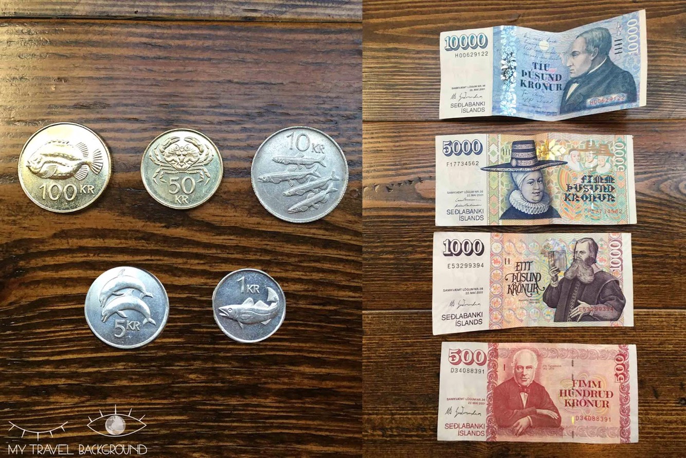Voilà un peu à quoi ressemble la monnaie… et il existe des pièces d’une couronne ! Soit 0,008€ ! Sachant que l’Islande est le 4e pays le plus cher du monde, je suis curieuse de voir à quel moment on va pouvoir écouler ces toutes petites couronnes ! En attendant j’aime beaucoup les symboles du monde marin qui les décorent !
