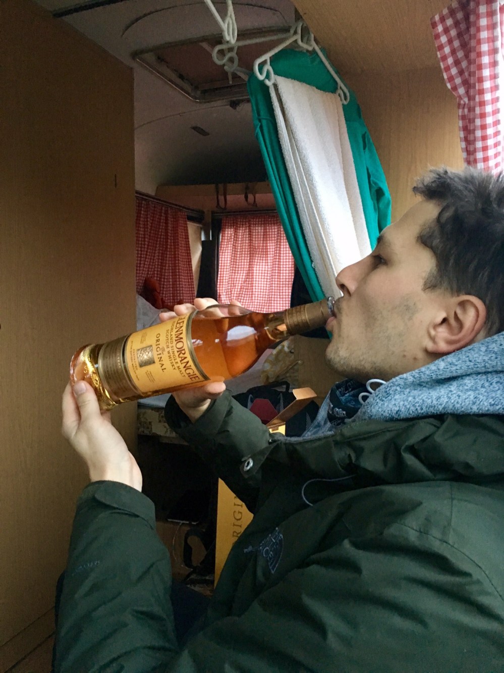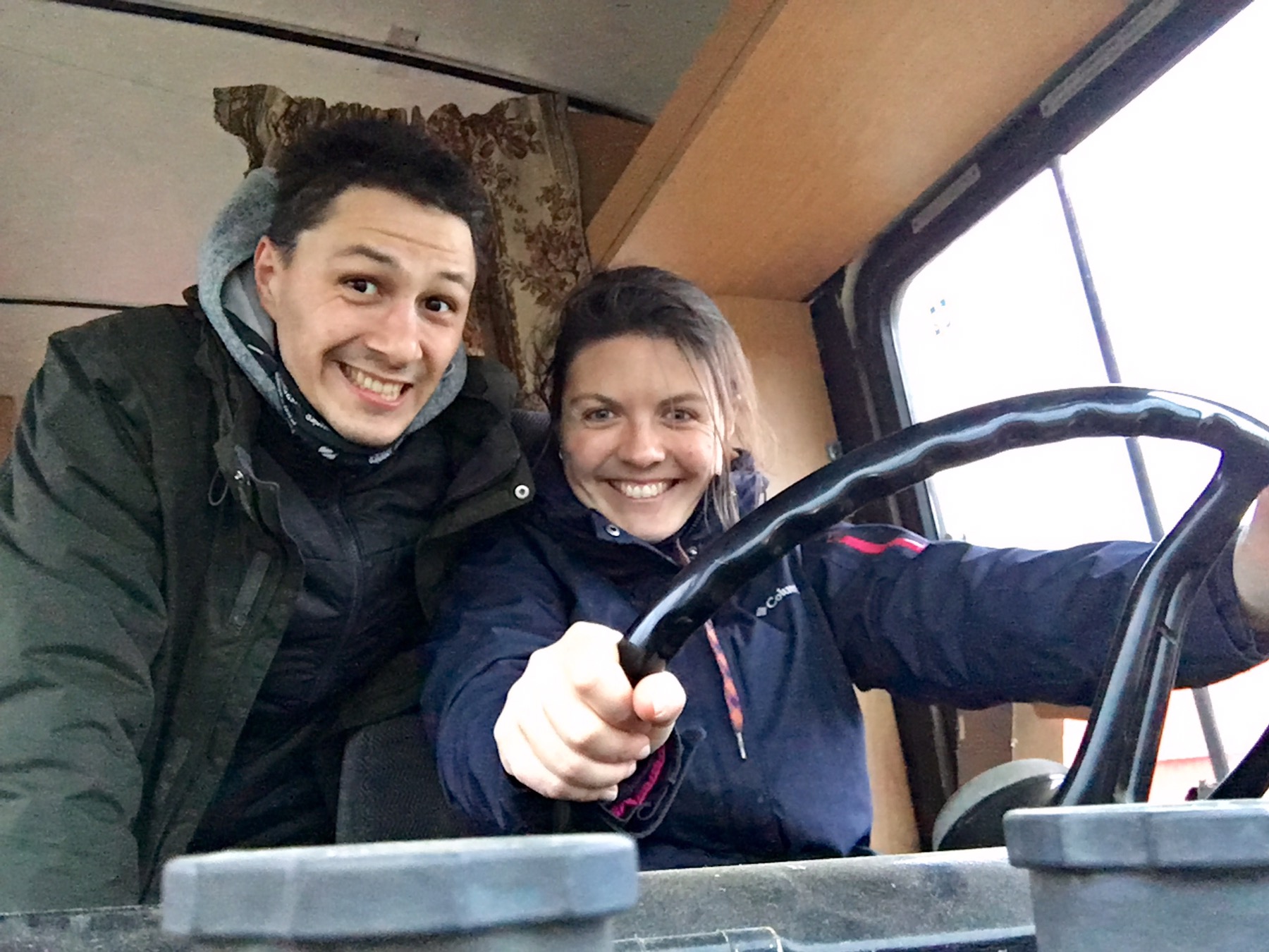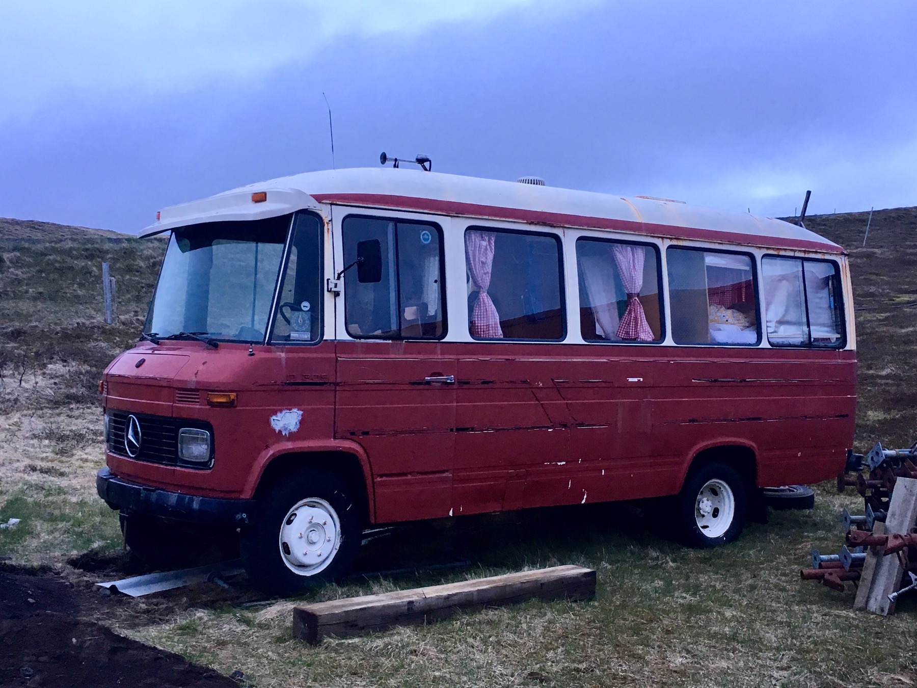 …dans une chambre en travaux avant de…… déménager dans le Van Mercedes ! Ca nous rappelle notre cosy caravan chez Seonaid en Ecosse. Sauf que la première nuit dans le van sera épique ! Après s’être un peu calmé, le vent s’est levé de nouveau, secouant notre roulotte de toute part !