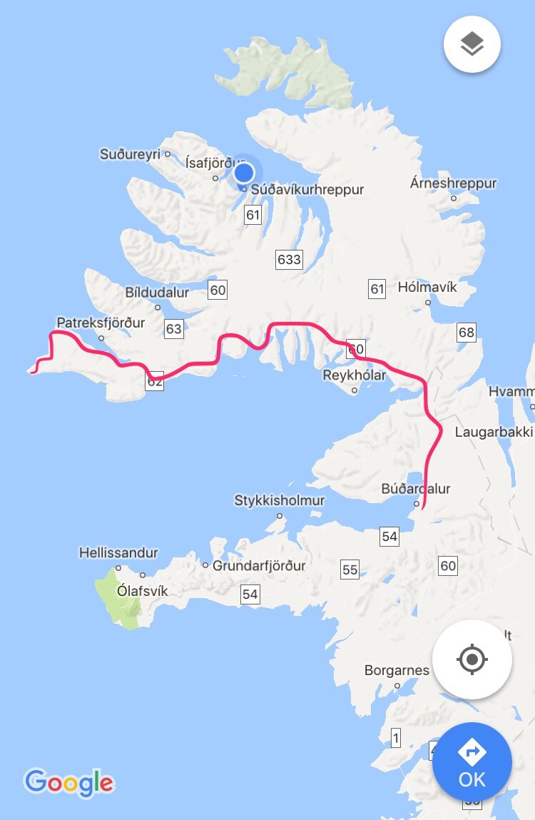 Direction les Fjords de l’Ouest. Notre parcours du jour ci-dessous.